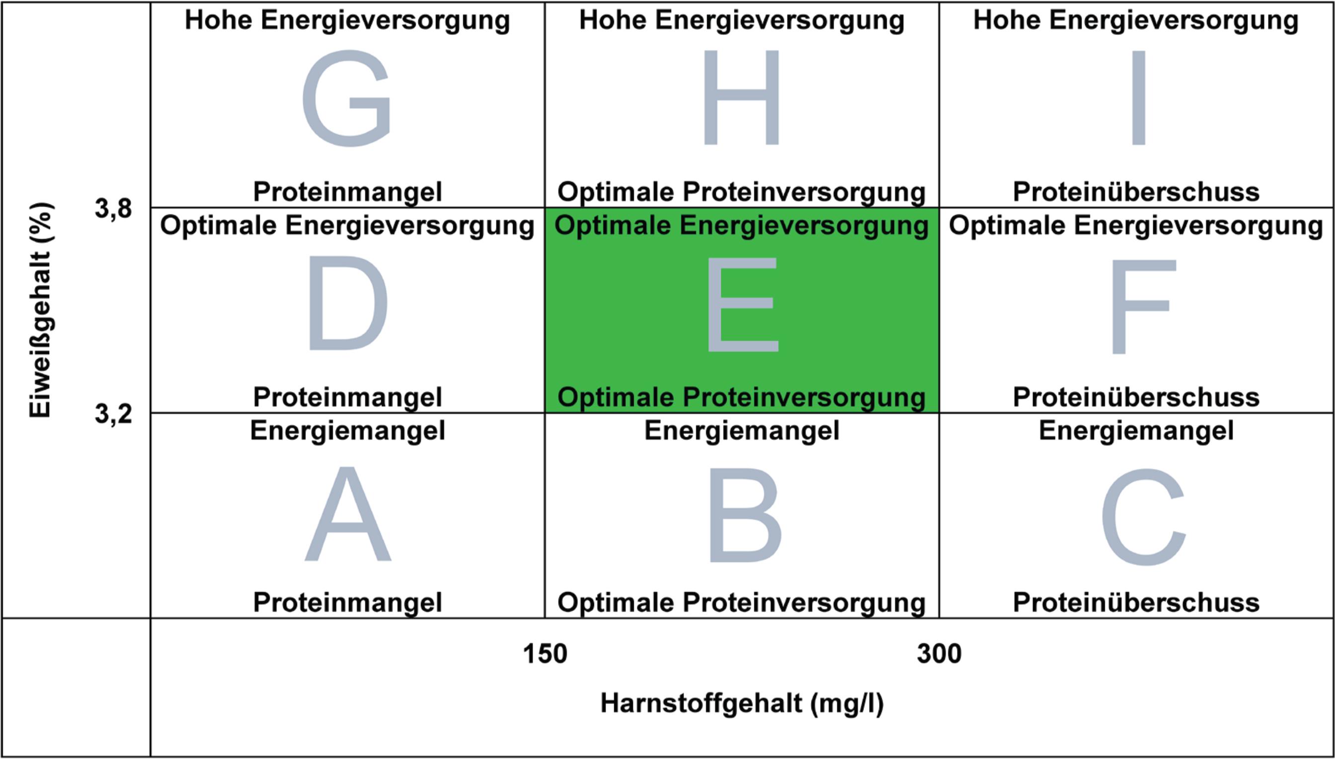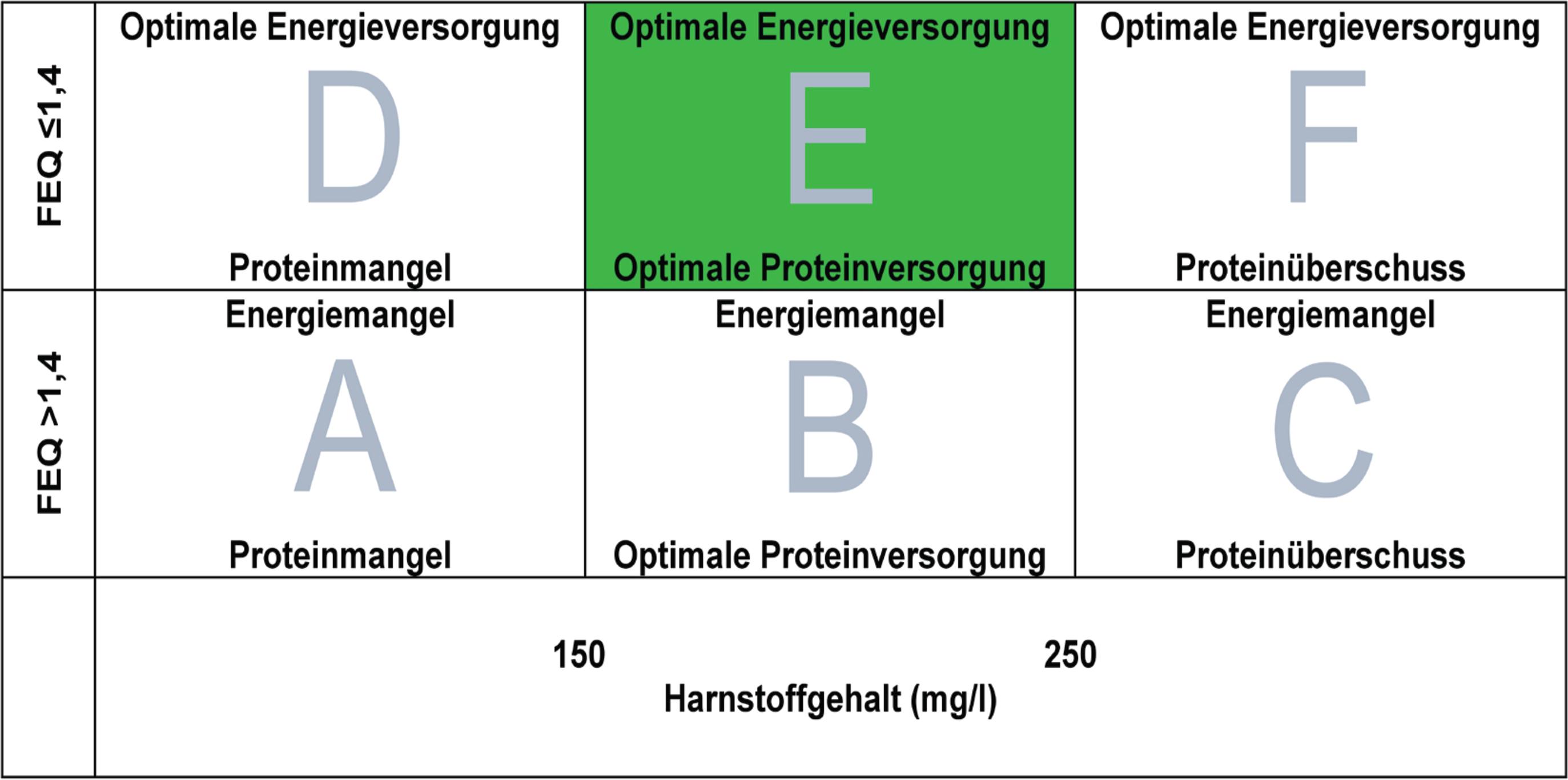 Eine grafische Darstellung zur Einschätzung der Versorgung anhand des Eiweiß- und Harnstoffgehaltes der Milch, entwickelt von Spohr und Wiesner (1991), wird seit circa 20 Jahren in Form einer Auswertung der Ergebnisse der Milchleistungskontrolle auf den österreichischen Höfen angeboten. Die sogenannte 9-Felder-Tafel soll die Landwirte bei der Kontrolle des Fütterungsmanagements unterstützen und auf eine Fehlversorgung hinweisen. Zunehmend gibt es aber auch Zweifel, wie gut diese Eintei-lung für die aktuellen Hochleistungstiere zutrifft, da deren Leistung durch Zuchtfortschritt und optimiertes Management steigt und dabei der Eiweißgehalt der Milch sinkt. Ein neues Bewertungsschema, die 6-Felder-Tafel, soll eine, dem Potenzial der Kühe besser entsprechende, grafische Einschätzungsform bieten (Losand et al., 2016). Die 9-Felder-Tafel geht dabei von einem Optimalversorgungsbe-reich bei 3,2 % bis 3,8 % Milcheiweiß und 150–300 mg/l Harnstoff aus (Abbildung 1 nach Spohr und Wiesner (1991)). Die 6-Felder-Tafel beurteilt die Energieversorgung nach dem Fett/Eiweiß-Quotient (FEQ) mit einer ausreichenden Versorgung bei einem Wert ≤1,4. Wegen seiner höheren Stabilität gegenüber Einflüssen der Milchmenge scheint er ein besserer Indikator für die Energieversorgung zu sein (Losand et al., 2016). Die unteren und oberen Harnstoffgrenzen wurden bei 150 und 250 mg/l Harnstoff fixiert (Abbildung 2 nach Losand et al., 2016).