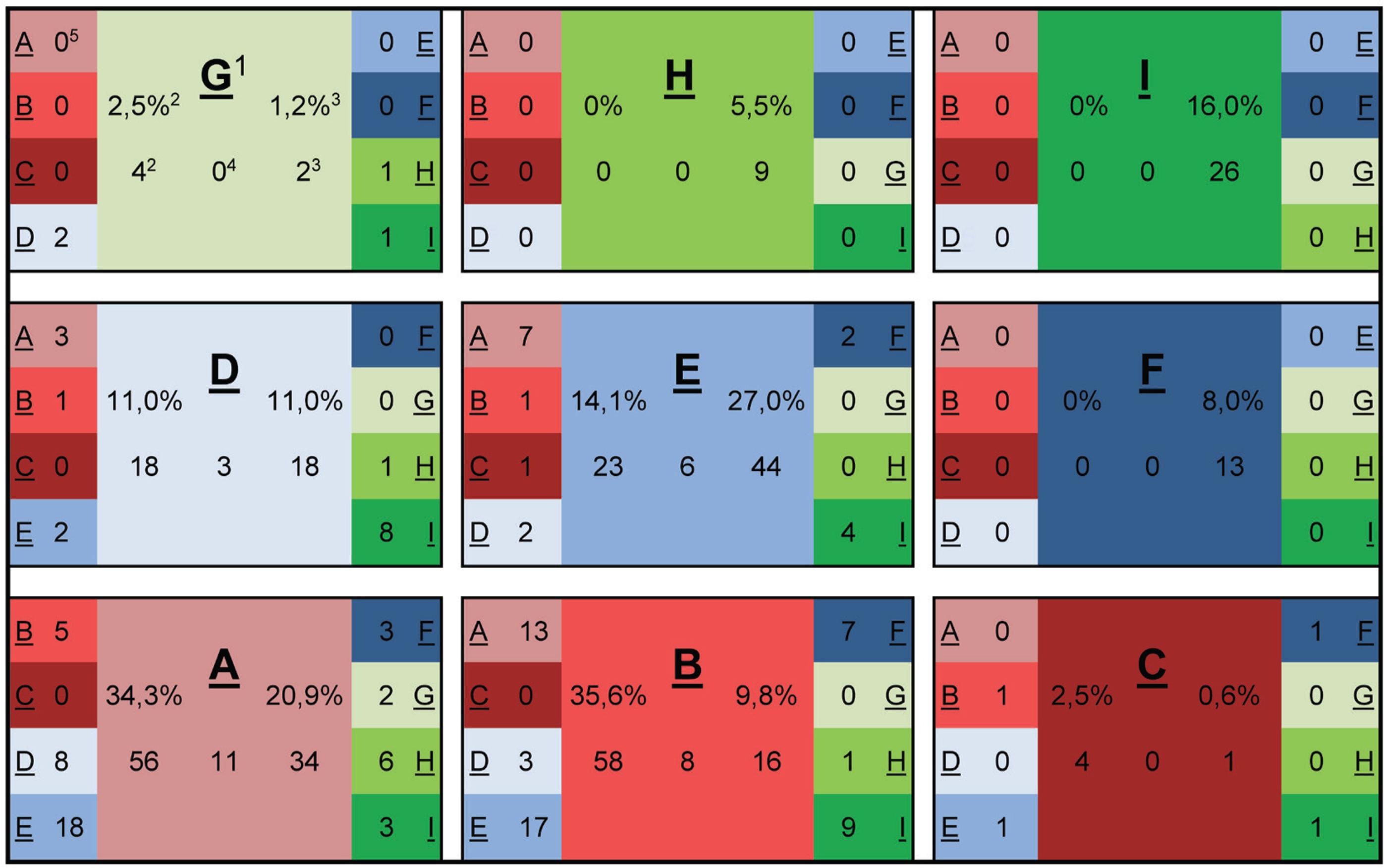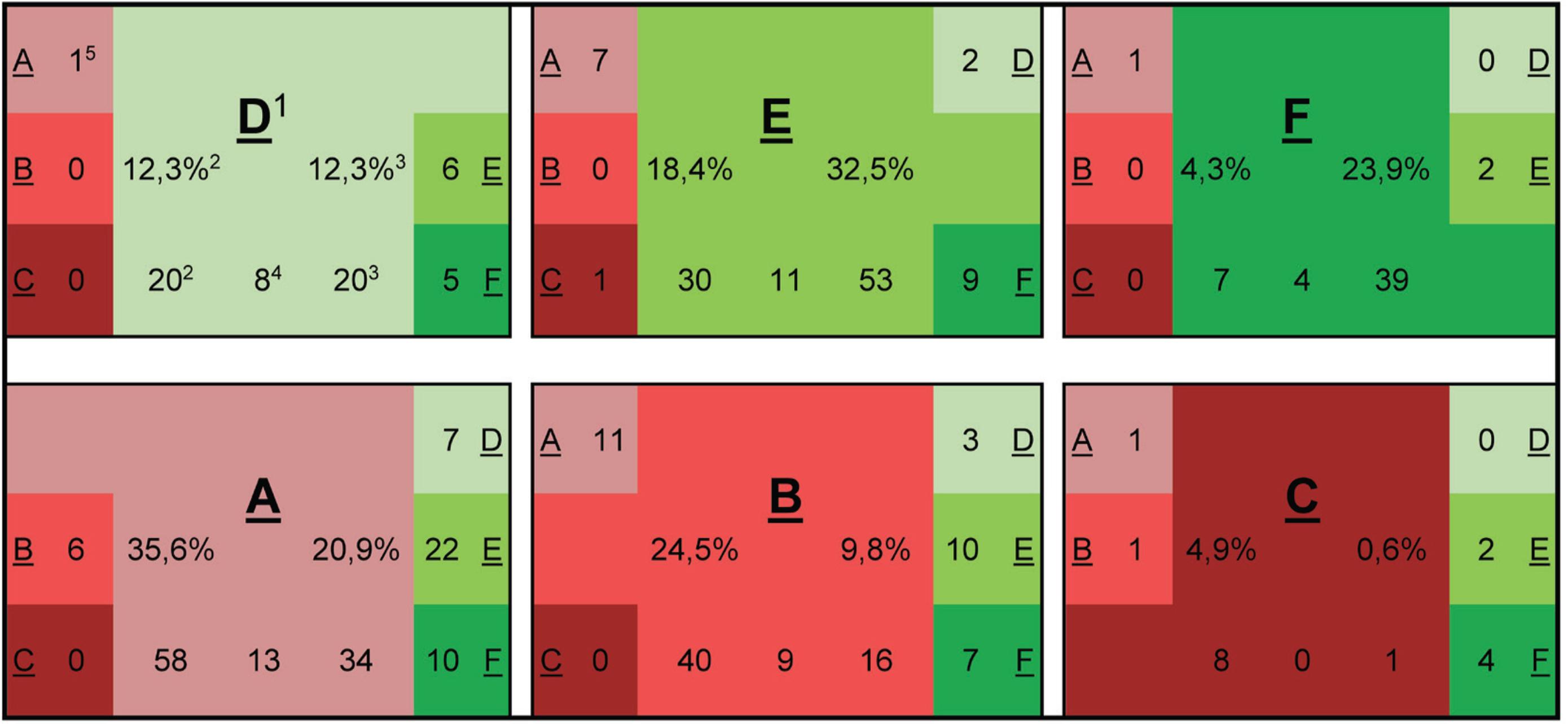 Die zur weiteren Auswertung verwendete grafische Darstellungsform ist in Abbildung 3 sowie Abbildung 4 ersichtlich. Die Felder der ursprünglichen Tafeln (Abbildungen 1 und 2) wurden mit den gleichen Buchstaben bezeichnet, wobei Feld A Protein- und Energiemangel darstellt. Eine Überversorgung mit Energie und Protein liegt bei der 9-Felder-Tafel für Zuordnungen zu Feld I vor, bei der 6-Felder-Tafel zu Feld F. Die Zahl unter der Feldbezeichnung gibt die absolute Anzahl der Beobachtungen an, bei denen die Beurteilung nach Milchinhaltsstoffen und die Versorgungsbilanz übereinstimmen. Daneben ist die Anzahl und über der Anzahl der Anteil der in dieses Feld eingeordneten Beobachtungen ersichtlich: auf der linken Seite auf Basis der Milchinhaltsstoffe und auf der rechten Seite nach der tatsächlichen Versorgungslage. Die unterstrichenen Buchstaben in den Randfeldern bezeichnen jene Beobachtungen, die gemäß Felder-Schema in das jeweilige Feld eingeordnet sind, aufgrund der Versorgungslage jedoch zu jenem in der Randleiste bezeichneten gehören.