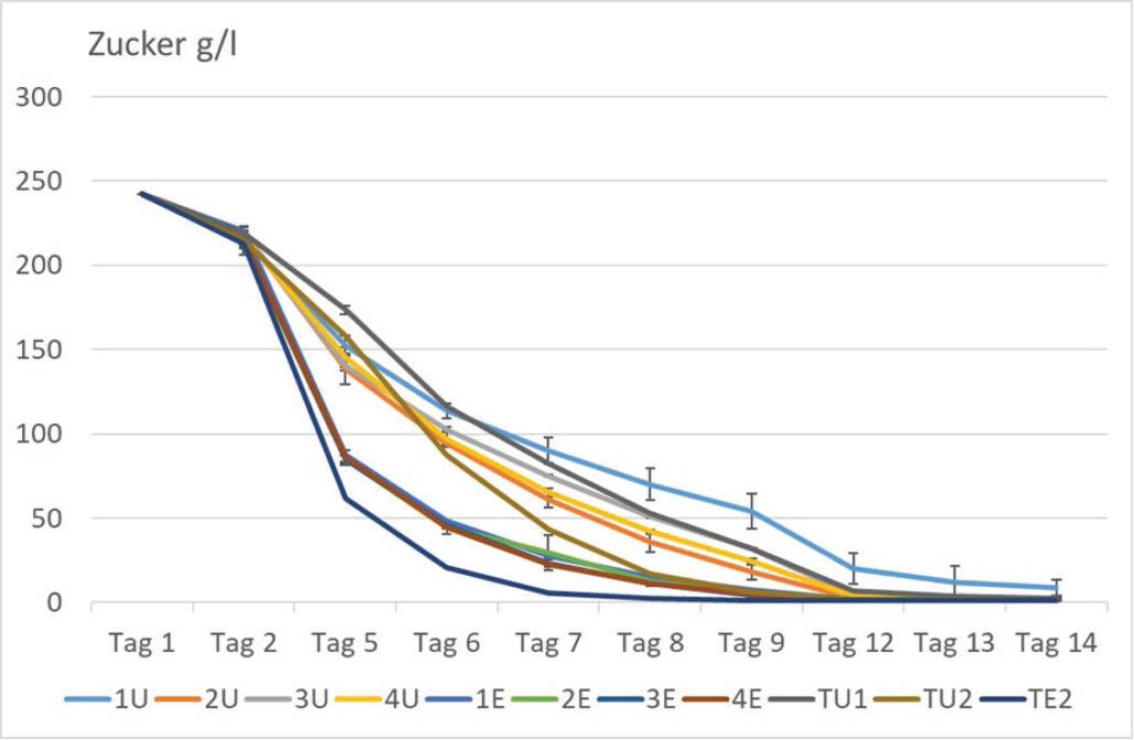 Darstellung der Rohdaten des Bentotests und Wärmetests1_ Hefe + Nährstoffe + Vitamin B, 2_ Hefe + Nährstoffe + Vitamine B + Lallzyme C-MAX™ + Lallzyme P1 + Lallzmye P2, 3_ Hefe + Nährstoffe + Vitamine B + Lallzyme P2, 4_ Hefe + Nährstoffe + Vitamine B + Lallzyme C-MAX™ + Lallzyme P1, U = unerhitzt, E = erhitzt, A, B, C = Wiederholung, T = TankTable 2_ Representation of the raw data of the Bentotest and the heat test1_ Yeast + Nutrients + Vitamin B, 2_ Yeast+ Nutrients + Vitamins B + Lallzyme C-MAX™ + Lallzyme P1 + Lallzmye P2, 3_ Yeast + Nutrients + Vitamins B + Lallzyme P2, 4_ Yeast + Nutrient s + Vitamins B + Lallzyme CMAX™ + Lallzyme P1, U = unheated, E = heated, A, B, C = repeat, T = tank