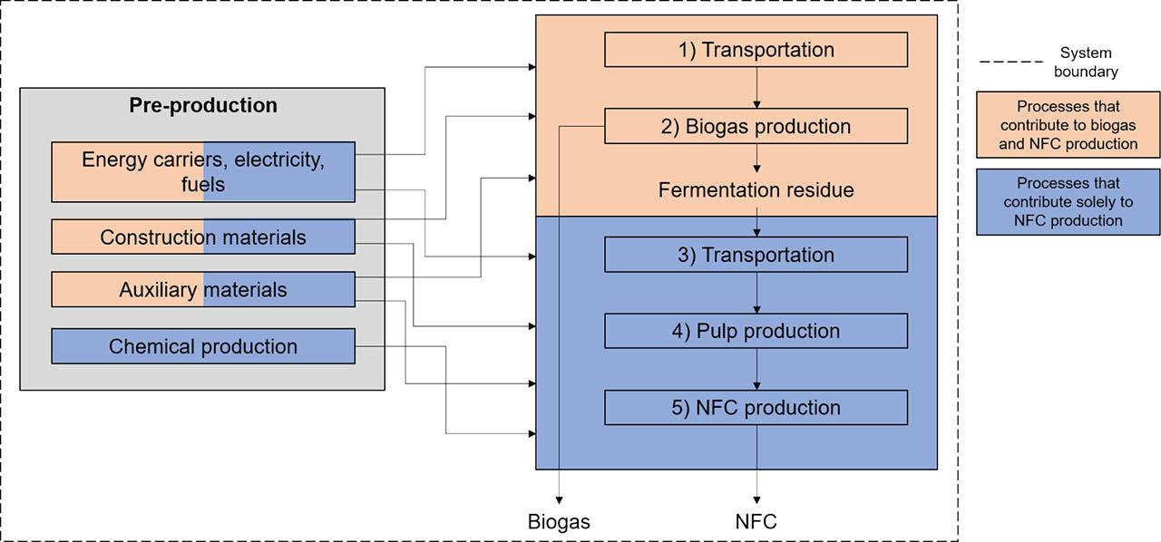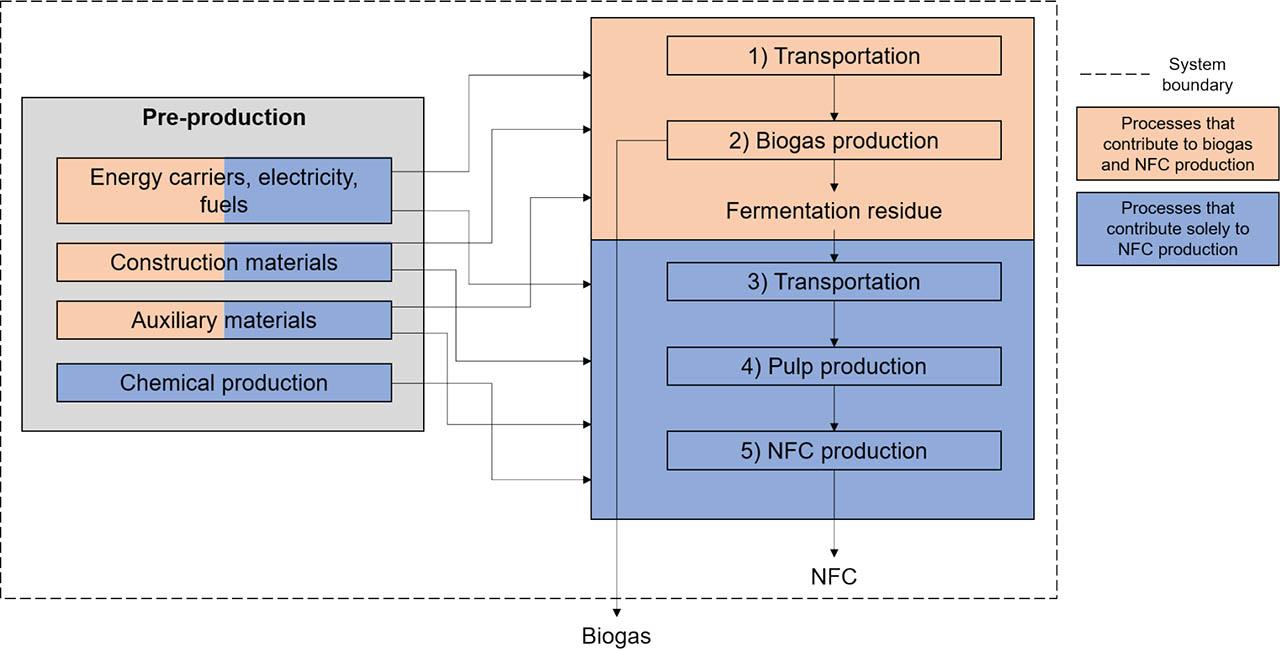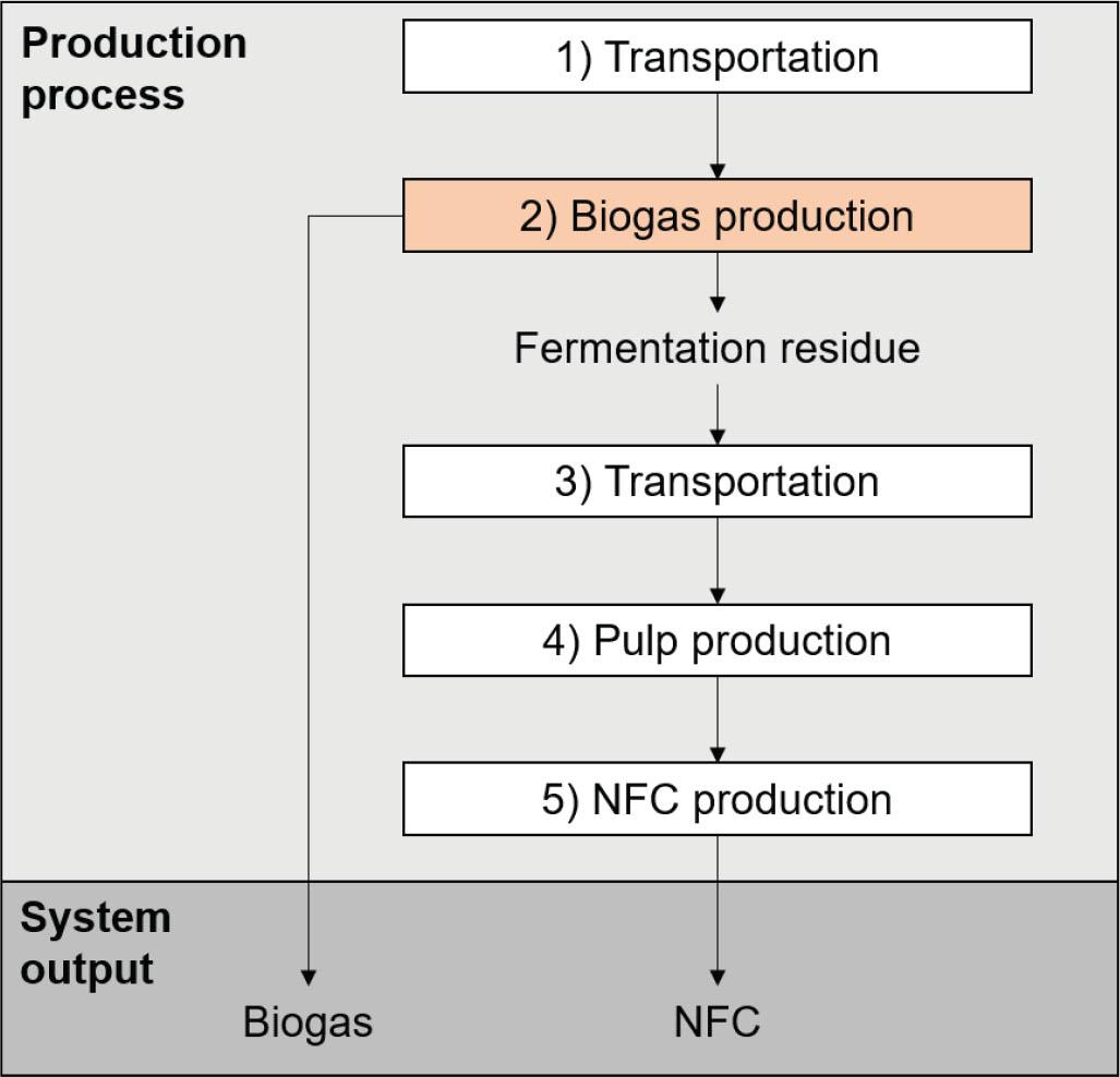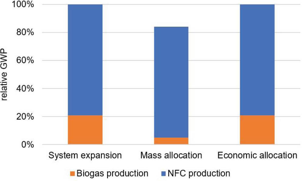 Comparison of GWPs of the overall system, the biogas and NFC production with the system expansion, mass allocation, and economic allocation approachesTabelle 5_ Vergleich des Treibhausgaspotenzials (GWP) des Gesamtsystems, der Biogas- und NFC-Produktion mit dem „Systemerweiterungs“-, Massenallokations- und ökonomischen Allokationsansatzes