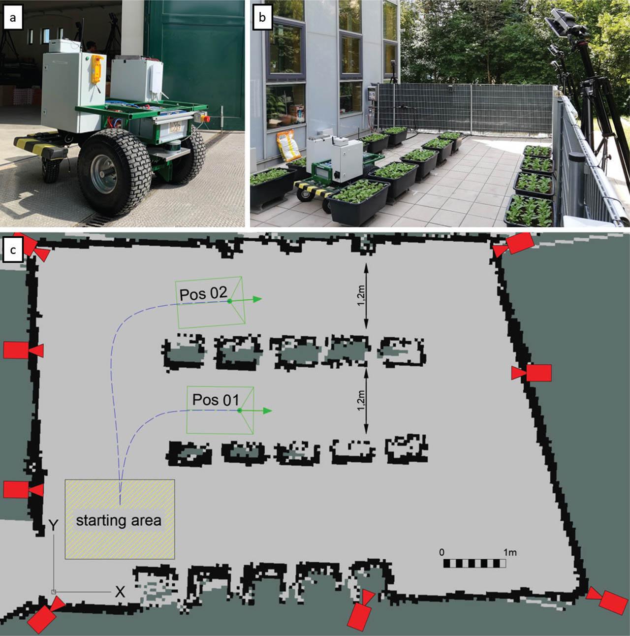 Experimental setup. (a) Picture of the field robot “Mathilda.” (b) Picture of the outdoor laboratory. (c) Map of the outdoor laboratory generated using a laser scanner and the ROS “gmapping” node with the starting area (yellow), the commonly used paths (blue), and target positions (green), as well as the Vicon Vantage V5 (red) camera positions indicated. ROS, robot operating systemAbbildung 1. Versuchsaufbau. a) Bild des Feldroboters “Mathilda”. b) Bild des Freilandlabors. c) Mit einem Laserscanner und dem ROS “gmapping”-Knoten erstellte Karte des Freilandlabors mit Angabe des Startbereichs (gelb), der gemeinsamen Wege (blau) und Zielpositionen (grün) sowie der Kamerapositionen der Vicon Vantage V5 (rot).
