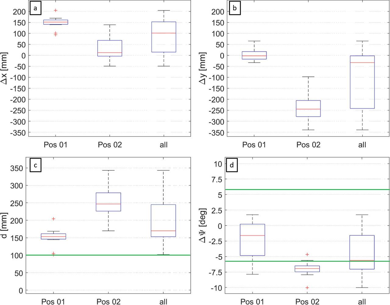 Boxplot of the deviation of the actual position to the target position. (a) Distance error in x-direction, (b) distance error in y-direction, (c) absolute distance error d, and (d) angular error ΔΨ for the two positions and the positions pooled together. Green lines indicate hysteresis threshold. Data are from 11 and 10 successful runs for position 1 and 2, respectively.Abbildung 2. Boxplot der Abweichung der Ist-Position von der Soll-Position. a) Abstandsfehler in x-Richtung, b) Abstandsfehler in y-Richtung, c) absoluter Abstandsfehler d und d) Winkelfehler ΔΨ für die beiden Positionen und die zusammengefassten Positionen. Grüne Linien zeigen die Hysterese. Die Daten stammen aus 11 bzw. 10 erfolgreichen Läufen für Position 1 bzw. 2.