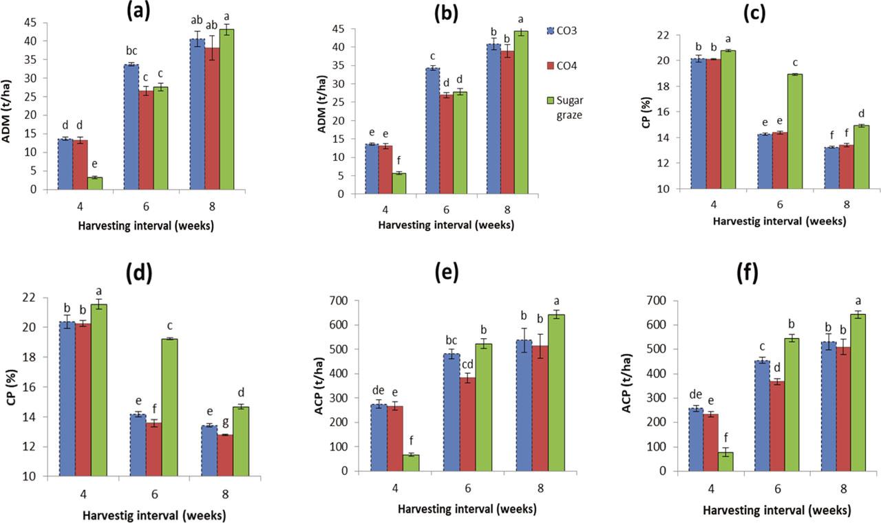 | Annual dry matter yield (t/ha) | CO-3 | 13.63 ± 0.35e | 34.24 ± 0.65c | 40.87 ± 1.56b | V | 0.000 |