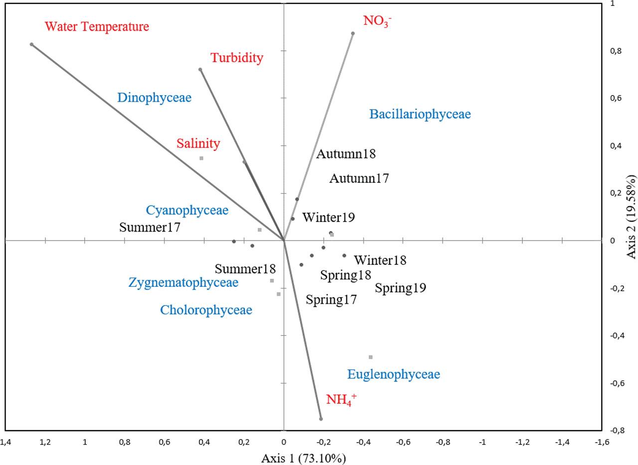 Dinophyceae and Cyanophyceae showed a preference for warmer waters with high water temperature, turbidity, and salinity. These taxa appear to be suitable in summer season. Bacillariophyceae positively correlated with nitrates and were abundant during autumn 2017 and 2018. Euglenophyceae tolerated high ammonium levels and were suitable for the three sampled spring seasons. Zygnematophyceae and Chlorophyceae do not seem to be affected by the physicochemical parameters taken into consideration (water temperature (WT), turbidity, salinity, nitrates, and ammonium) in our study; they generally exhibit a preference for the summer season.