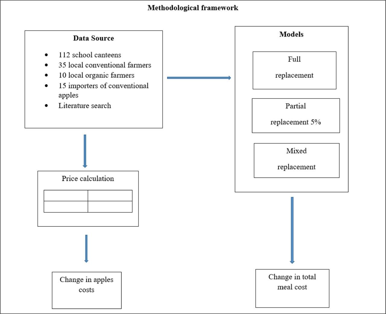 Figure 1 is a methodological framework that illustrates the different replacement scenarios modeled to assess the financial implications of substituting imported apples with locally grown conventional and organic apples in Czech school meals. It also highlights the different data sources and price modeling.