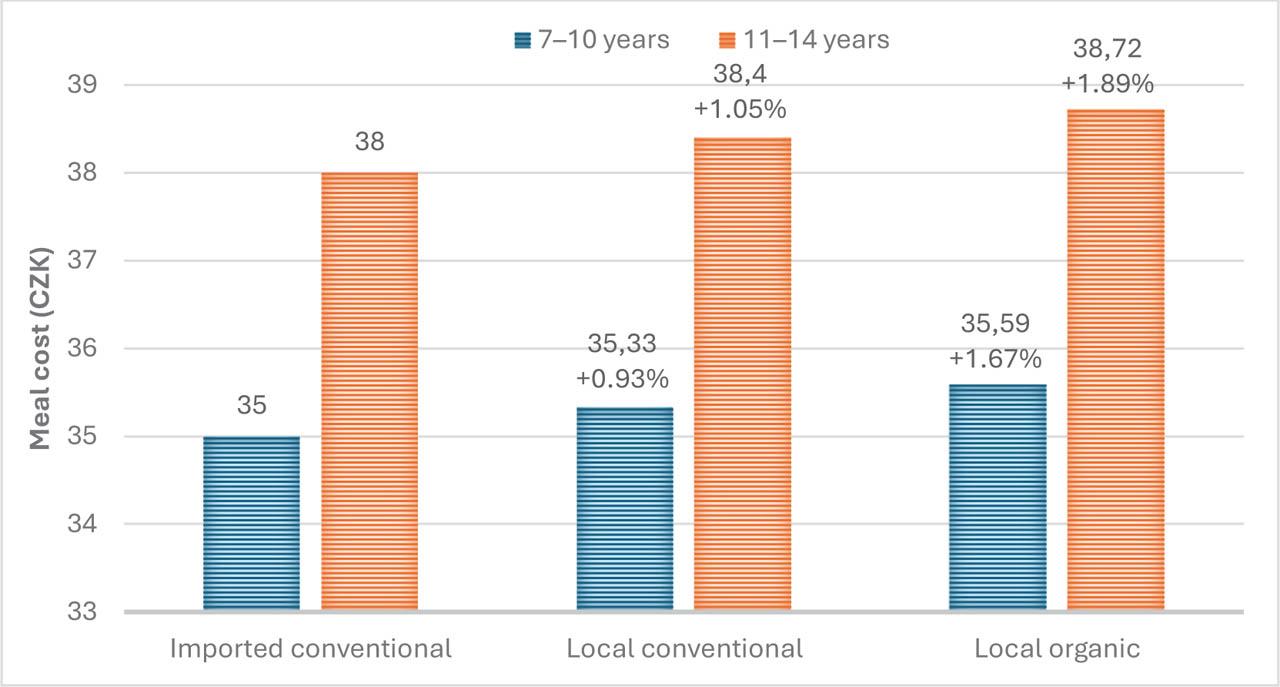 The shih toward more sustainable and healthier food systems in Czech public schools, as indicated by the replacement of imported conventional apples with local apples, presents both challenges and opportunities. The findings of this study provide evidence that it is economically possible to integrate locally grown and organic apples into Czech school meal systems with a slight cost increase per meal portion. Even in the most expensive scenario, where imported conventional apples were completely replaced by local organic apples, the overall cost increase was limited to 1.89% for children aged 11–14. Such marginal increase challenges the prevalent belief that organic and local food options are costly for public institutions (Doležalová et al., 2016; Løes and Nölting, 2011; Nielsen et al., 2009).