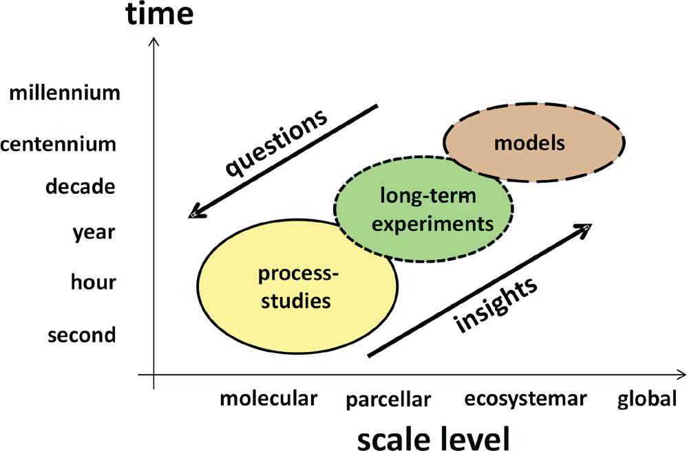 Long-term experiments, however, also enjoy great esteem that goes far beyond purely scientific prestige. Janzen (2009) describes them as so-called listening places, places where you can feel the pulse of the earth and wait patiently until you can hear and see the slowly emerging development trends in our ecosystems. Long-term experiments not only allow the collection of data that could never be obtained without them. They also guide us to numerous questions that are dealt with on a smaller scale in the field of basic research. Findings from such process studies (e.g., belowground carbon allocation of plants, carbon transfer to soil microbes) stimulate new measurements and surveys in the long-term experiments, which in turn give rise to new questions. Janzen (2009) sees in this interplay an important stimulation of productive cooperation between different scale and time levels, in which long-term experiments in any case occupy an important and central position ( Figure 1). Beyond this integration of LTEs into the research framework on grassland, he also points out that such experiments will be increasingly needed in the coming decades due to increasing (especially man-made) stresses. He proposes seven questions to right their best possible conservation for our descendants: