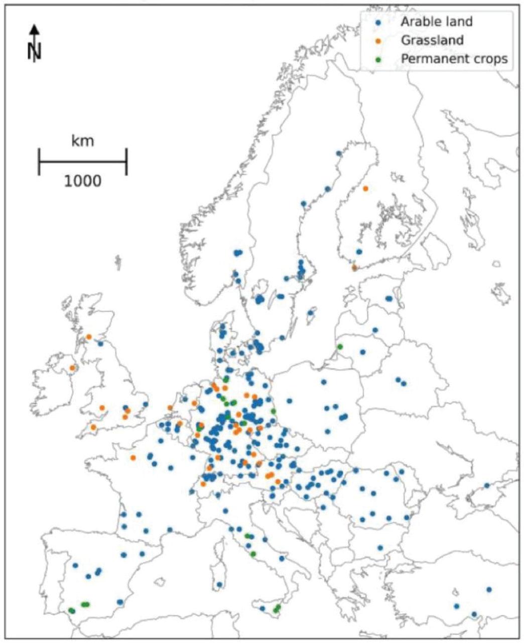 Geographical distribution of ongoing long-term experiments on permanent grassland, arable land and other crops in Europe (https://www.bonares.de/service-portal/data-repository; last access: 09/2025)