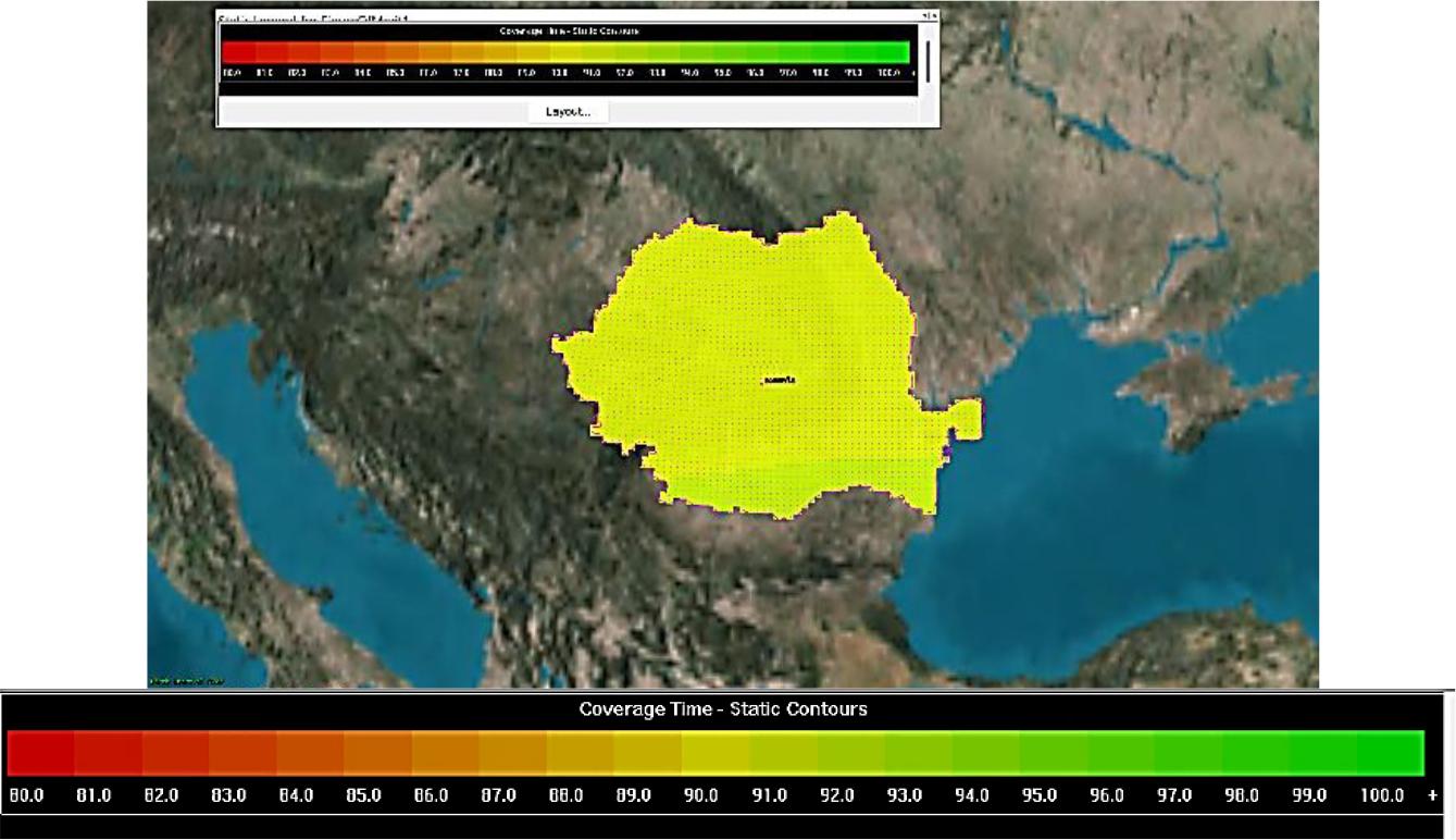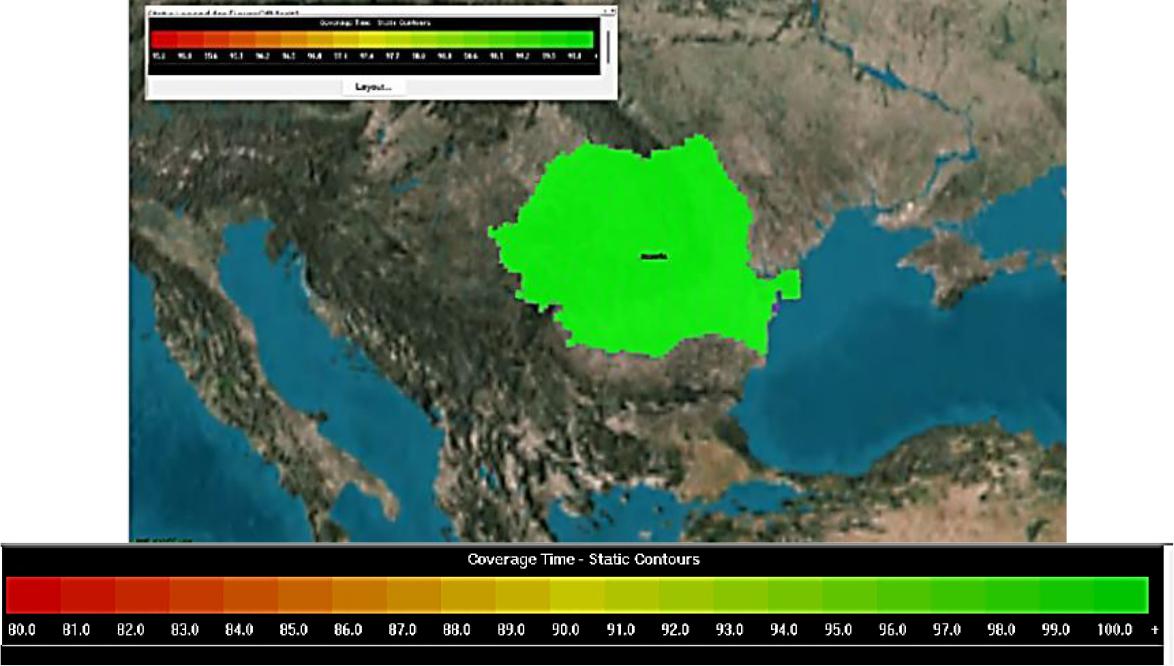 This delta-type orbital geometry improves the spatial distribution of satellite footprints and eliminates service discontinuities, resulting in continuous 100% signal availability across the entire Romanian territory. The coverage performance is further depicted in Figure no. 5, which presents the Figure of Merit (Coverage Time) map.