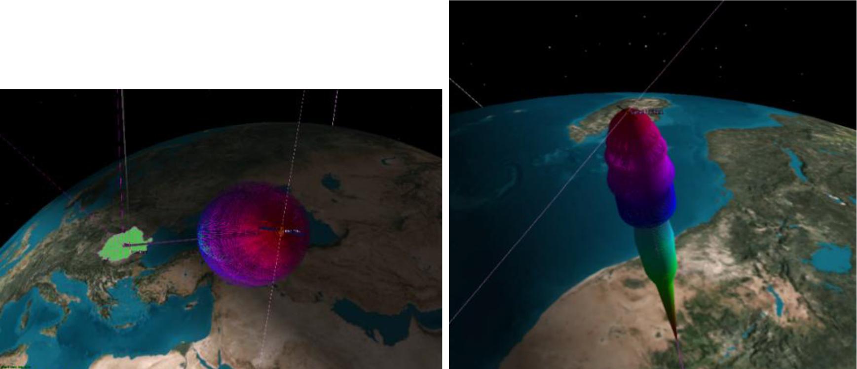 Scenario 2 consisted of a constellation of six satellites distributed across two orbital planes, each with an inclination of 57°. The results showed a variable signal coverage between (51.79-79.89) %, with signal outage intervals, between (718-2700) seconds. These values highlight that the reduced number of satellites and the lack of diversity in inclinations cannot guarantee continuous coverage of Romania territory, leading to uncovered areas and unacceptable outage times for critical communication applications. The configuration of this scenario is illustrated in Figure no. 2, where the left image shows the satellites coverage footprint, while the right illustrates the distribution of satellites in two orbital planes around Earth and the 2D image highlighting coverage gaps over Romania.