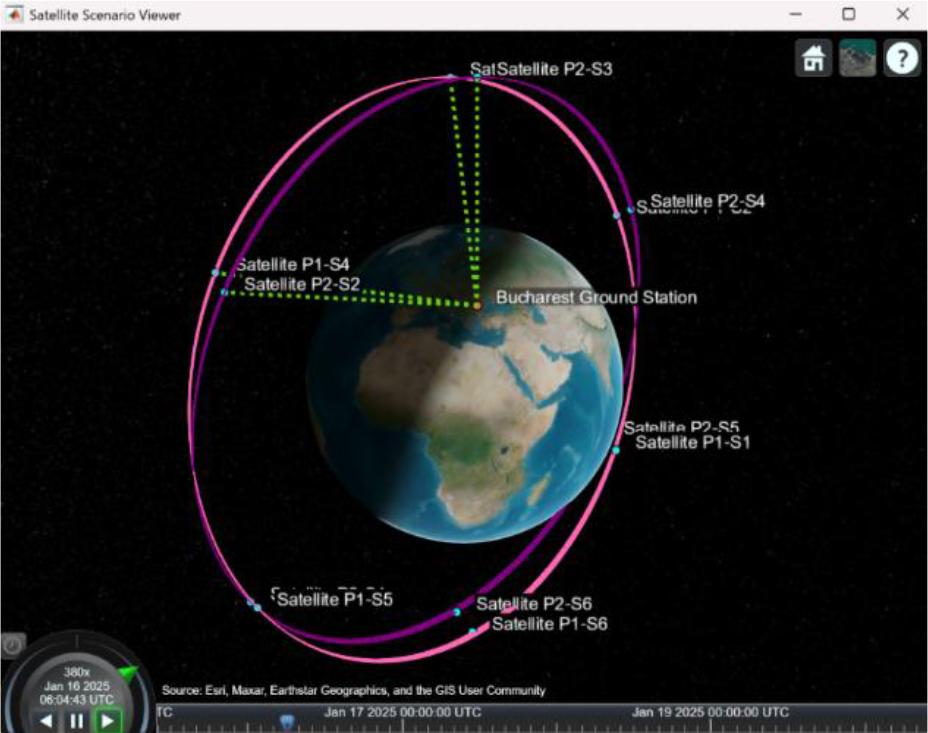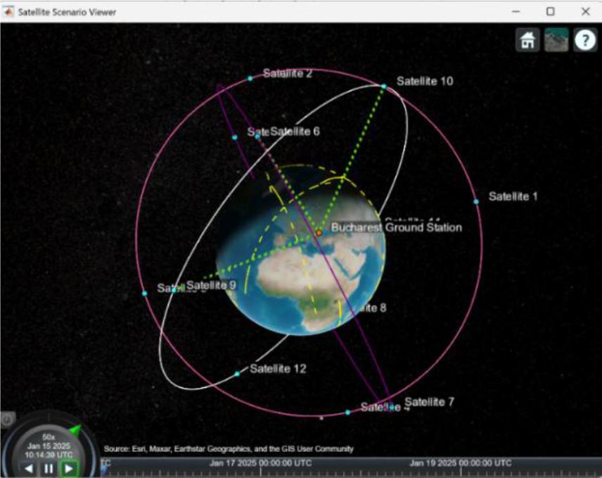 Visualization of the optimized satellite constellation and the access link between satellites and the Bucharest ground station in the Satellite Scenario Viewer environment (Source: Author, generated in MATLAB R2025a, The MathWorks Inc.)