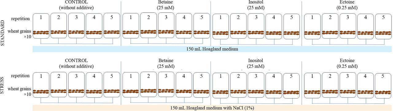 Two experimental variants were used: (1) standard medium; (2) stress medium. The standard medium refers to the Hogland solid medium, while the stress medium was prepared by adding sterile, free-flowing NaCl (Sigma Aldrich) to the medium in an amount allowing a final concentration of 1% (m/V) (Nazarov et al., 2022). This study aimed to test the effect of osmoprotectants on plants under high stress conditions – hence a concentration of 1% (m/V), corresponding to about 0,17 M L−1 (Kłosowska, 2010). A scheme of the experiment is shown in Figure 1.
