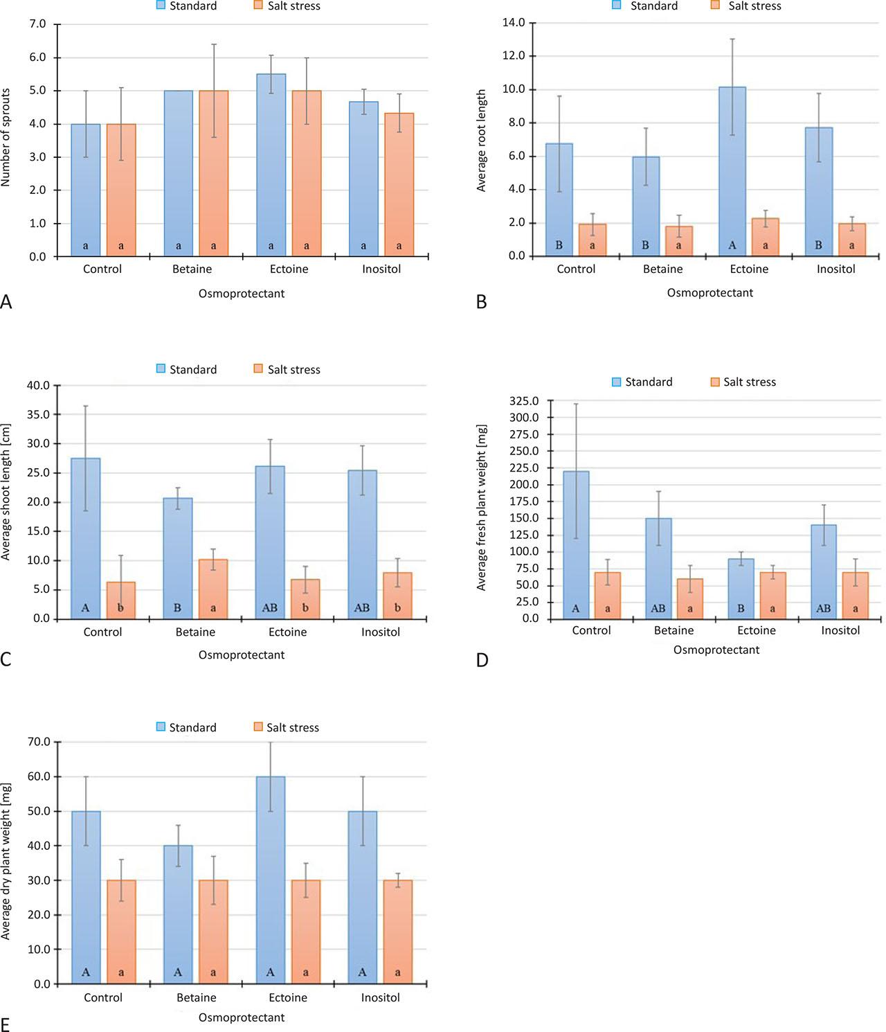 control – culture without addition of osmoprotectants; standard – Hoagland medium without NaCl; salt stress – Hoagland medium with NaCl (1% m/V); vertical lines indicate SE; Different lowercase letters ‘a–b’ indicate a significant difference for plants growing under salt stress conditions; different uppercase letters ‘A–B’ indicate a significant difference for plants growing on standard medium; both at p < 0.05, n = 10, Tukey HSD test, ANOVA.