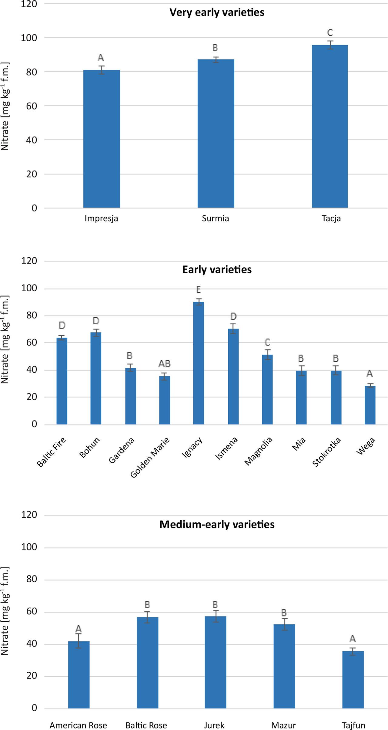 Our research confirms other reports that there is a relationship between decreasing nitrate levels and extending the growing season of potato tubers. In the study of Trawczyński (2021), the nitrate content in tubers of the group of very early, early and medium-early varieties was 127.7 102.4 and 86.3 mg kg−1, respectively. On the other hand, in the study of Mazurczyk and Lis (2000), the nitrate content in tubers of the group of very early and early varieties was much higher and amounted to 224 mg kg−1, in the group of medium-early varieties it was 108 mg kg−1. The nitrate content in the group of medium-late and late varieties was similar to the results we obtained in our study for varieties in the medium-early group, and amounted to 44 mg kg−1 f.m. (Mazurczyk, Lis, 2000).