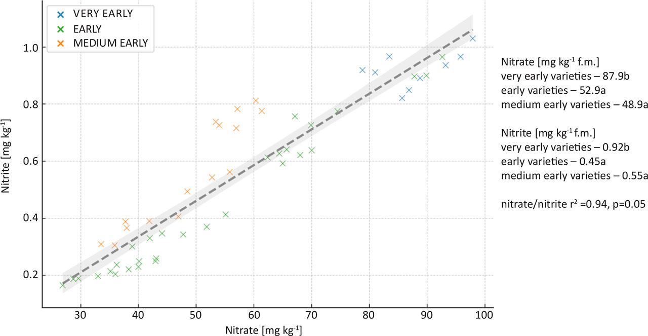 Relationship between nitrate and nitrite content in potato tubers of different earliness groups. Statistically significant differences in nitrate and nitrite levels among the earliness groups are annotated beside the graph. Means sharing the same letter are not significantly different (p<0.05).