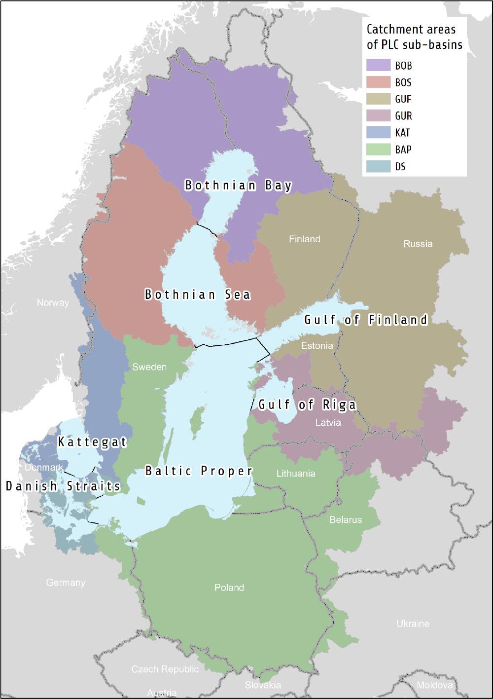 The catchment area and basins of the Baltic Sea covered by PLC monitoring.