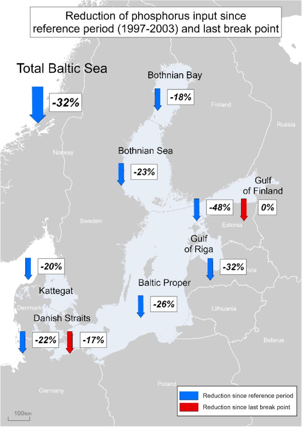 However, statistically significant reductions have been achieved in all sub-basins since the reference period (1997–2003). The highest input reductions were achieved in the Gulf of Finland (48%), Gulf of Riga (32%) and Baltic Proper (26%) (Fig. 2). Phosphorus inputs to the entire Baltic Sea have been reduced by 32%, and about 65% of this reduction was due to reduced phosphorus inputs to the Gulf of Finland and Baltic Proper.