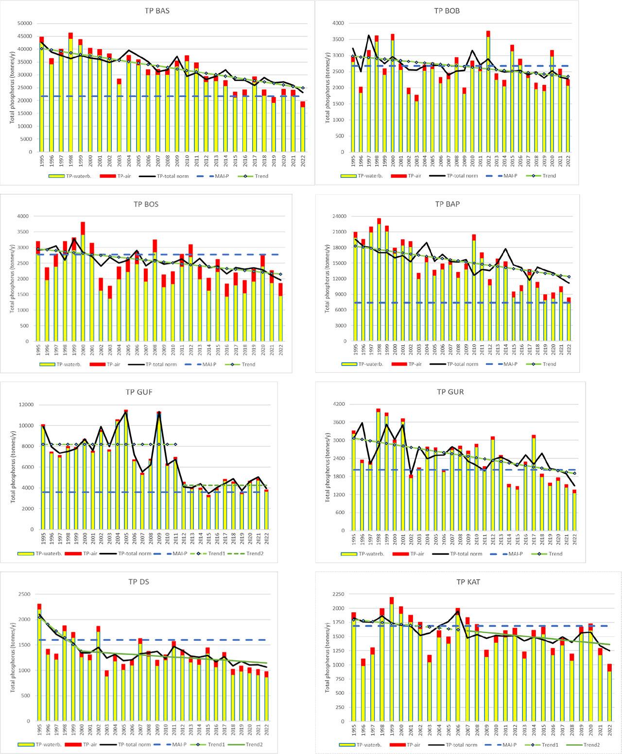 BAS – Baltic Sea, BOB – Bothnian Bay, BOS – Bothnian Sea, BAP – Baltic Proper, GUF – Gulf of Finland, GUR – Gulf of Riga, DS – Danish Straits, KAT – Kattegat. The normalized total annual inputs of phosphorus are given as a black line. The trend line for normalized total phosphorus is given as a green line with markers. In cases when a break point divides the trend into two parts, the second part (called trend 2) is shown by a green line without marker. In cases with two breaks points the third part (called trend 3) is indicated as a purple line. (Solid trend line shows statistically significant trend and dotted line no statistically significant trend). The MAI as adopted by the 2013 HELCOM Copenhagen Ministerial Meeting (HELCOM 2013) is shown as the bold dotted blue line.