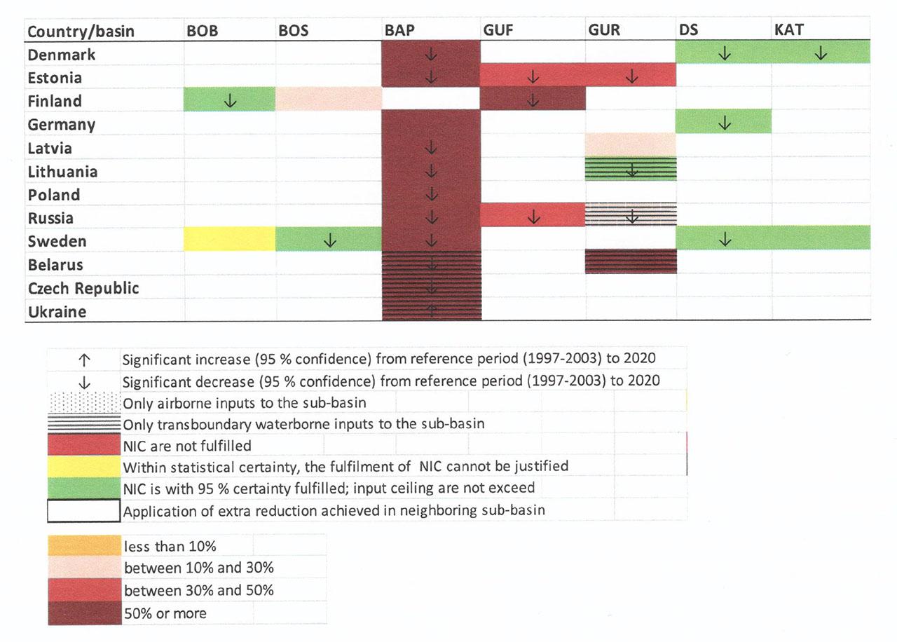 The overall results of progress towards phosphorus NICs by 2020 show that without taking into account extra reduction in neighboring basin NICs are not fulfilled for Baltic Proper and only fulfilled for Kattegat (Fig. 4).
