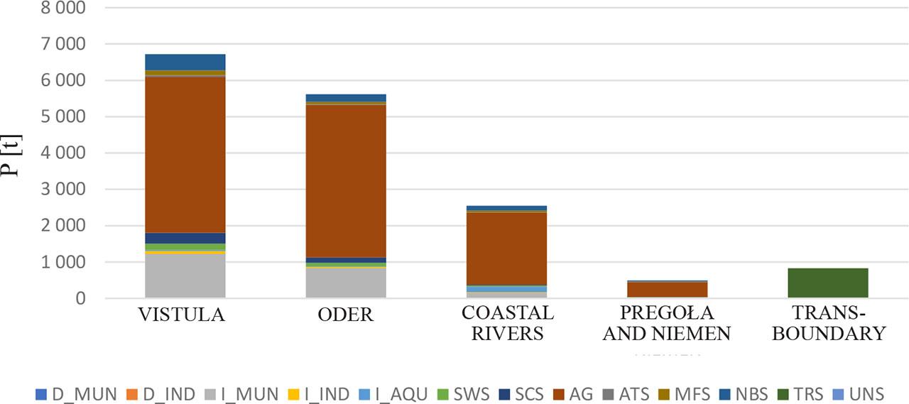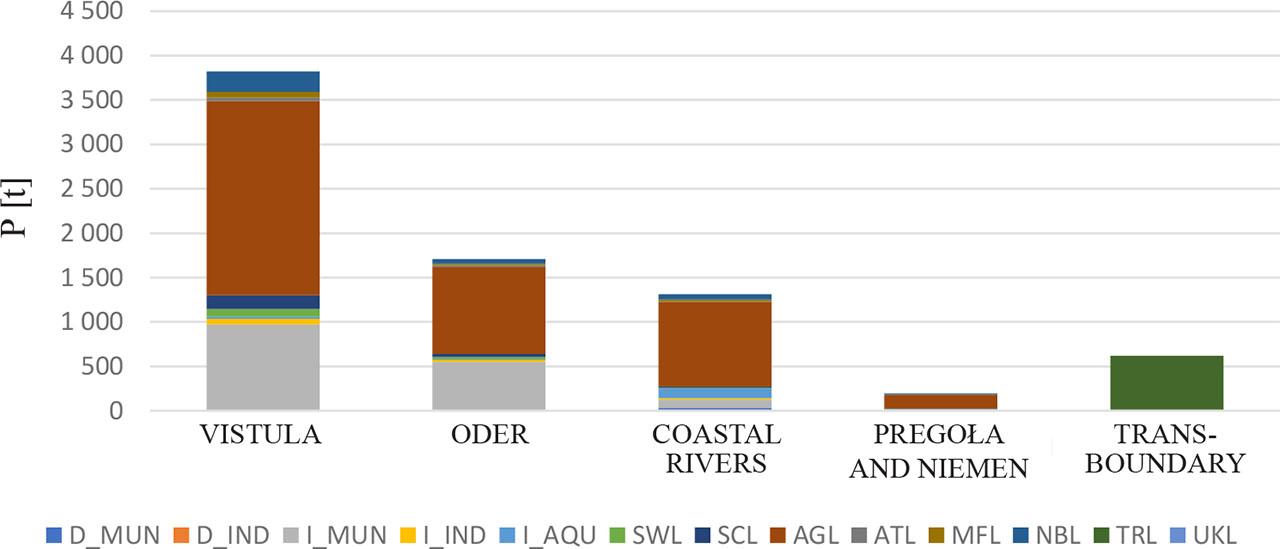 River loads from: MUN – municipal point sources, IND – industrial point sources, MWL – municipal sewage treatment plants, INL – industrial sewage treatment plants, INL – industrial sewage treatment plants, FIL – aquaculture (salmon farming), SWL – sewage from storm overflows of combined sewers and surface, subsurface and ground runoff from undeveloped areas (sanitary sewage from unsewered areas and from the natural background), SCL – sanitary sewage from non-sewered areas, AGL – agriculture, ATL – atmospheric precipitation on the surface of inland waters, MFL – municipal sewage treatment plants, NBL – natural background, TRL – transgenic sub-catchments outside Poland, UNL – unknown sources, D – direct, I – indirect