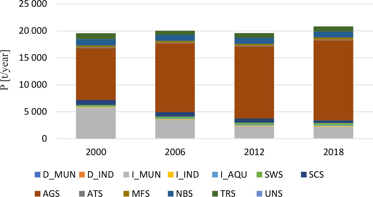 MUN – municipal point sources, IND – industrial point sources, AQU – aquaculture, SWS – overflows and surface runoff from urbanized areas, SCS – sewage from unsewered areas, AGS – agriculture, ATS – direct atmospheric deposition, MFS – commercial forests and wastelands, NBS – natural background, TRS – transgenic cargo, UNS – loads of unknown origin, D – direct, I – indirect