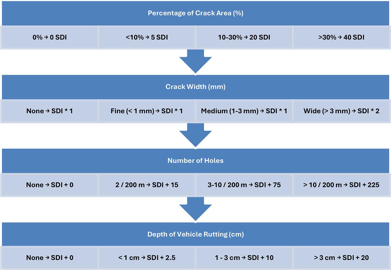 However, SDI has its limitations as well. SDI might not be as thorough or complete in identifying distress as the PCI, which uses defined methods to classify severity and contains more specific distress kinds. Furthermore, unlike mechanical techniques like the Falling Weight Deflectometer (FWD), SDI does not measure structural capacity or subsurface conditions. Additionally, it does not quantify ride quality or rider comfort, unlike the International Roughness Index (IRI) (Al-Neami et al., 2018). The SDI is nonetheless a useful tool for initial evaluations and decision-making despite these drawbacks, particularly when paired with additional metrics in a multi-criteria pavement management framework.
