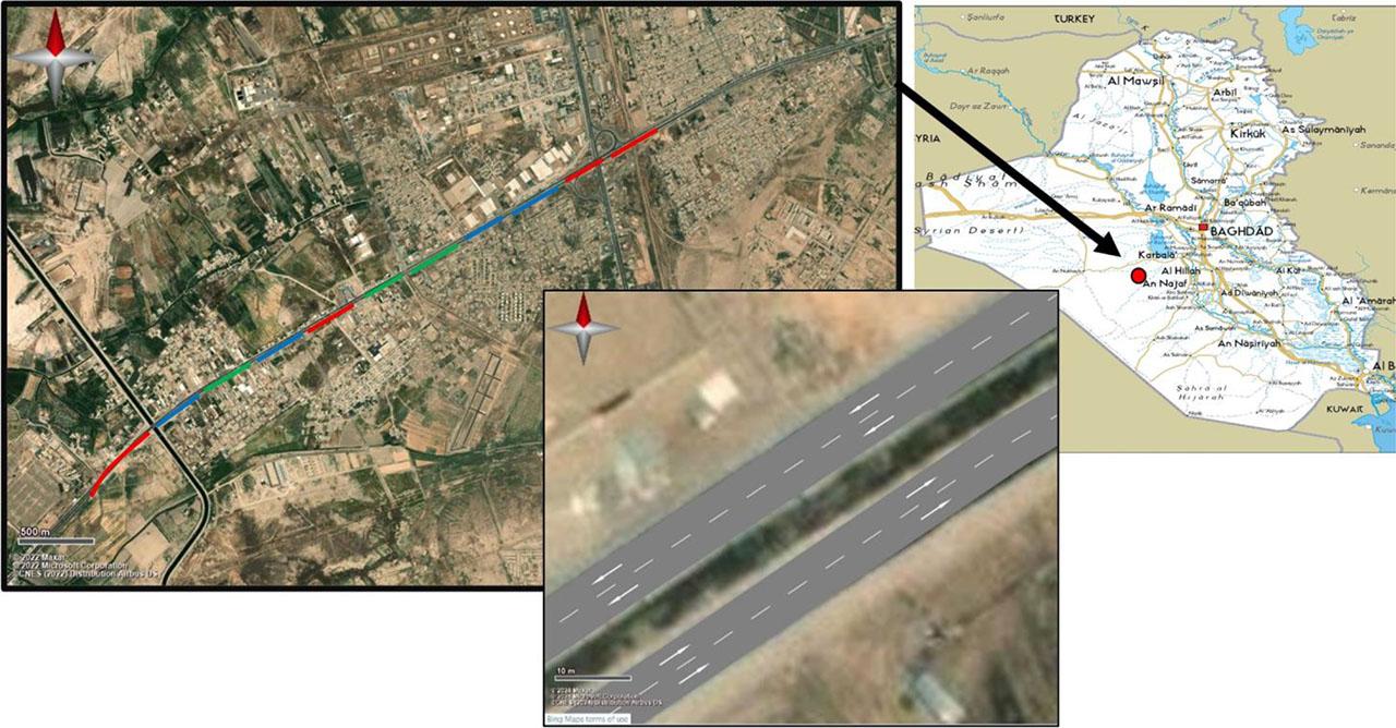 The selected road for the current case study is Al-Rabea Highway in Diwaniya city, south of Iraq, which is an urban area; it begins at Al-Shaafa’ town and ends in the city of Diwaniyah. It is a dual carriageway with two lanes per direction (10 m average width for each side) with a 4 m median. This highway serves many government institutions, hospitals, recreational centers, and companies, in addition to residential areas. This highway accounted for a significant portion of the damage. Figure 2 illustrates the location of the selected road.