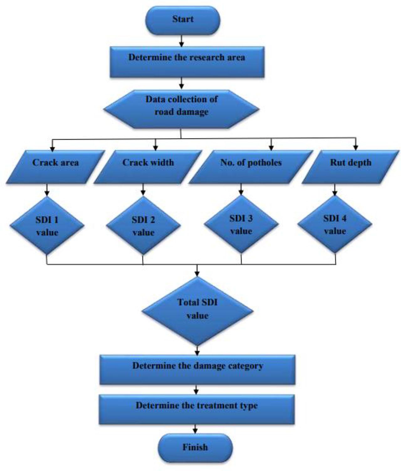 The Surface Distress Index (SDI) method was created by the Directorate General of Bina Marga in 2011 for a national road condition survey manual that is intended for road managers to assess pavement conditions and as a foundation for determining the kind of road maintenance needed (Al-Mansour et al., 1999; Isradi et al., 2021; Mahardika et al., 2021; Paikun et al., 2021; Yusup and Kartika, 2019). This method visually assesses the road condition by using the characteristics of total crack area, average crack width, number of potholes, and depth of vehicle rutting. Figure 1 (Al-Neami et al., 2018; Isradi et al., 2021; Paikun et al., 2021) shows SDI values for various damage types. Based on the SDI values, potholes are identified as the primary source of damage. In addition, Table 1 lists the categories of road damage based on the total SDI values.