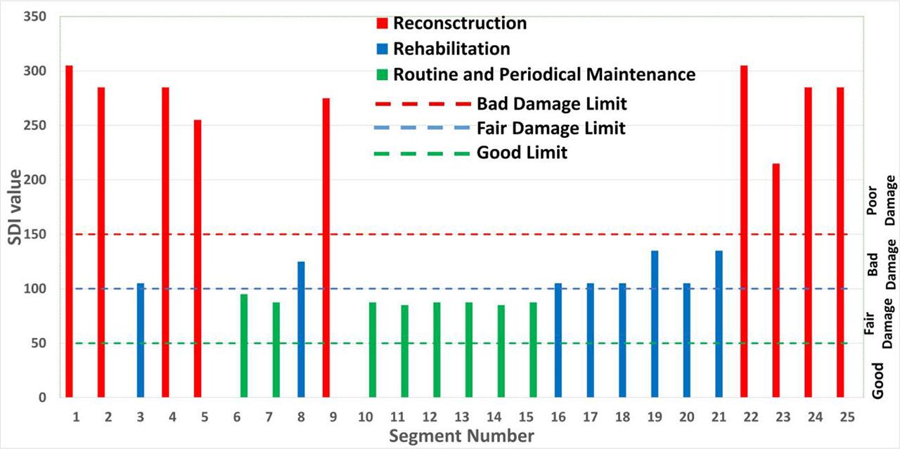 The damage caused by potholes and rutting accounts for 36% of the selected roads (9 segments) are in poor condition (SDI value >150), according to the SDI ranges given in Table 1. Additionally, 8 segment parts (or 32% of the chosen road) are in bad condition, while only 8 segment parts have moderate damage. Moreover, there is no section in good condition (SDI <50). To avoid overlapping, SDI values are assigned to the highest category (worse case) within their defined range. For example, an SDI of 100 is categorized as “Bad”. As shown in Table (3), policymakers and managers can use the ideas and recommendations for road damage treatment based on the SDI technique as a basis for decision-making to implement adequate and effective road handling and estimate the necessary budget. In total, 36% of the roads need reconstruction, 32% needs rehabilitation, and 32% need normal and periodic maintenance. Figure 6 serves as a guide for gathering research data for each segment, making it easier to explain how the results of the SDI study should be interpreted, and identifying areas where the condition of the road needs maintenance, rehabilitation, and reconstruction.