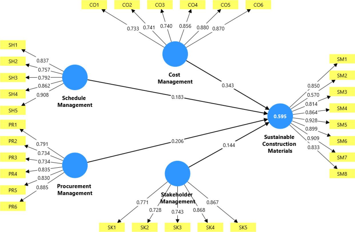 The output results show that the independent variable “Cost Management” (beta 0.343, t-value 4.134, and p-value 0.000) demonstrates greater variation and has a significant impact on the dependent variable “Sustainable Construction Materials.” Procurement Management (beta 0.206, t-value 2.36, and p-value 0.018) shows moderate variation and a moderate effect on Sustainable Construction Materials. Schedule Management (beta 0.183, t-value 2.12, and p-value 0.034) has a weak influence on Sustainable Construction Materials, whereas Stakeholder Management (beta 0.144, t-value 1.887, and p-value 0.059) has an insignificant effect on Sustainable Construction Materials. Table 5 presents a summary of the structural model, variance inflation factor (VIF), beta coefficients, sample means, standard deviations, t-statistics, and p-values.