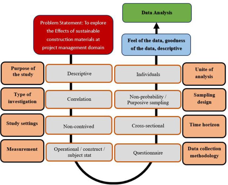The study utilized the quantities approach in order to achieve research aims and objective. A comprehensive literature was conducted by the research to identify the challenges faced in the move towards sustainable construction practices. The questionnaire was developed with four independent variables namely cost challenges, schedule challenge, procurement challenges, stakeholder challenges, and one dependent variable named sustainable construction materials. Primary data was collected through an online questionnaire survey with key members of construction professionals working on various ongoing building projects. Purposive sampling techniques were used, and the collected data was further analyzed using partial least squares structural equation modeling (PLS-SEM). Figure 2 shows the research flowchart diagram.