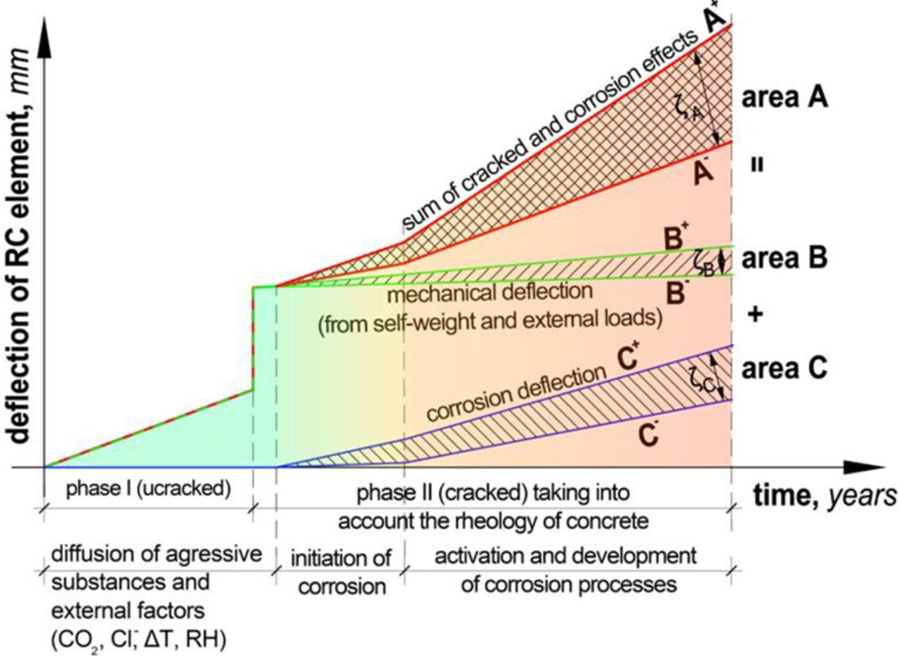The coupling of mechanical and corrosive phenomena is a process fraught with significant uncertainty due to the wide range of factors influencing the development and evolution of these processes. The deterministic model assumes that cracking occurs in the structure's loaded state and before the initiation of corrosion processes, due to the necessary time required for the migration of aggressive substances and the depassivation of the reinforcement. Similarly to the deterministic model, the uncertainty-based model also considers two phases of the structure's operation: the aggressive effects of the external environment on steel and the effects of concrete rheology. The diagram of the possible deflection areas, considering the uncertainty of deflection over time, is presented graphically in the graph (Figure 1). The corrosion processes affecting the deflection of the element, considering the uncertainty for the assumed parameter dispersion, are indicated in the Figure 1 by region C, bounded by lines C− and C+, which correspond to the lower and upper limits of the deflection, respectively. The phenomena included in region C include the loss of reinforcement mass and a decrease in Young's modulus. The increase in deflection due to mechanical impacts is indicated in the Figure 1 by region B, bounded by the lower and upper limits, respectively, by lines B− and B+ The range of region B is dictated by the assumed dispersion of uncertainty for the creep coefficient, representing the rheology of the concrete, and external loads. The model assumes that self-weight is not subject to uncertainty. By applying the principle of superposition, it is possible to determine the sum of regions C and B as the resulting region D, which represents the possible occurrence of deflection of the corrosion element, considering the uncertainty of the initial parameters. According to the proposed model, the influence of uncertainty begins only after corrosion processes develop, and over time, considering concrete rheology and load changes. The model assumes that these processes occur in the second phase of the reinforced concrete element's operation, after cracking. Up to this time limit, the entire evolution of deflection changes results solely from deflection due to mechanical impacts. When corrosion initiation and rheological processes begin, deflections gradually increase. The above theoretical assumptions provide the basis for deriving functional relationships describing the analytical approach to estimating corrosion current density, considering the uncertainty of the proposed model's parameters.