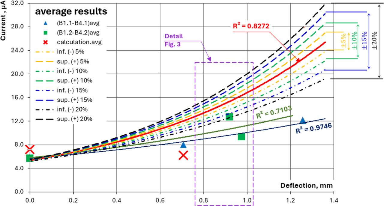 The detailed graph (Figure 3) shows how corrosion current levels can be estimated based on changes in component deflection while considering the percentage dispersion of model parameters. Using the example presented, the obtained results can be analysed assuming that the component deflected by 0.2 mm within a range of 0.8 to 1.0 mm. After relating the deflection limits to the trend lines describing the calculated quantities, estimated corrosion current ranges can be determined for individual uncertainties. For the described case, the corrosion current ranges for uncertainties of 5, 10, 15, and 20%, respectively, will take the following forms: