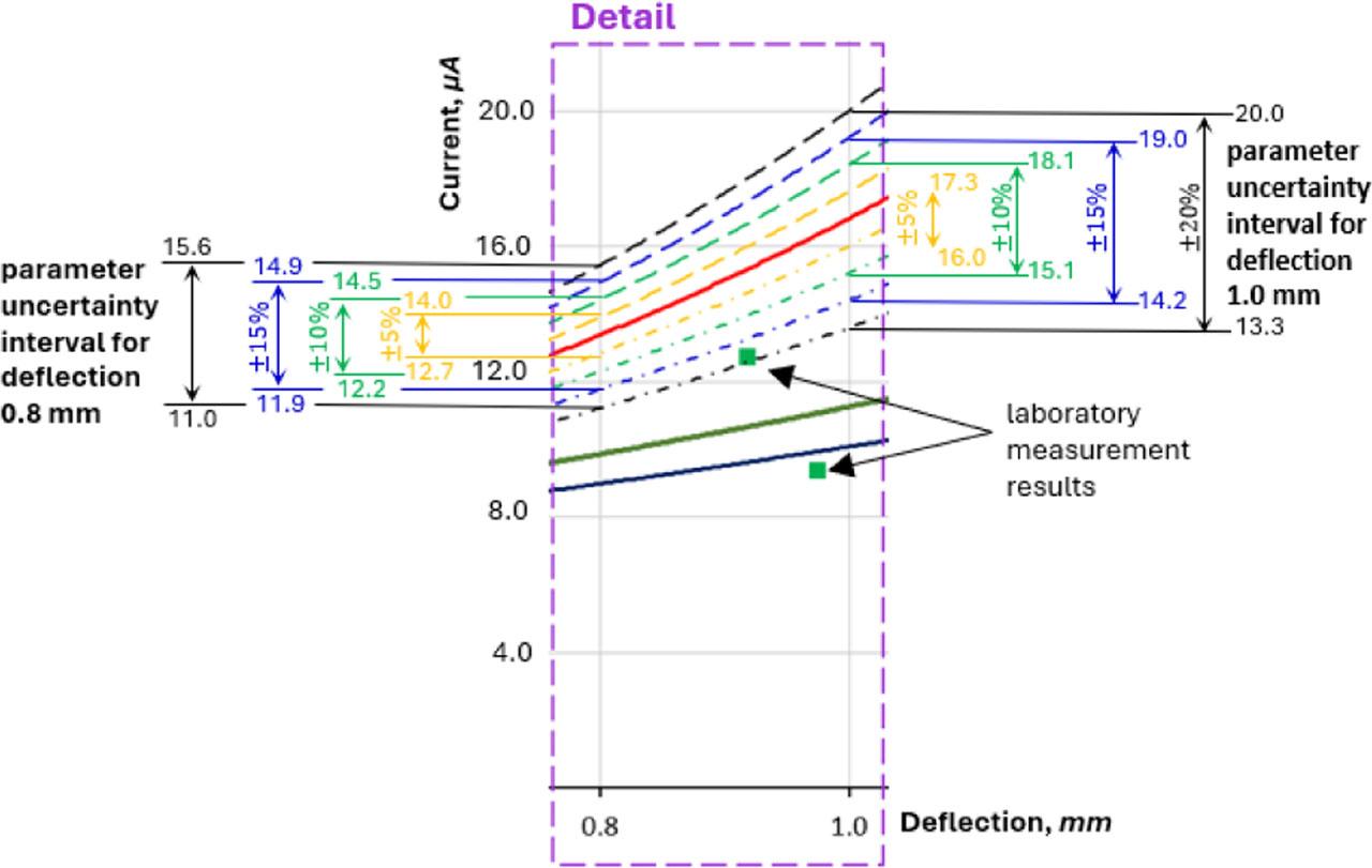 Based on the assumed uncertainties for individual measurements, the corrosion current intensity was determined using the relationships (7–13). The obtained results are presented in the form of a graph (Figure 2), which is superimposed with the results of deterministic calculations and the results obtained during laboratory tests (Recha, Raczkiewicz, et al., 2025). To more clearly present the calculation results for all quantities within the individual uncertainty ranges, exponential trend lines were determined, which also serve as boundaries for the specific scatter of uncertain parameters. The graphical interpretation should be treated as an estimate of the corrosion current level based on the physically measured deflection increase. The reading method, considering the assumed uncertainties, is shown in the Figure 3.