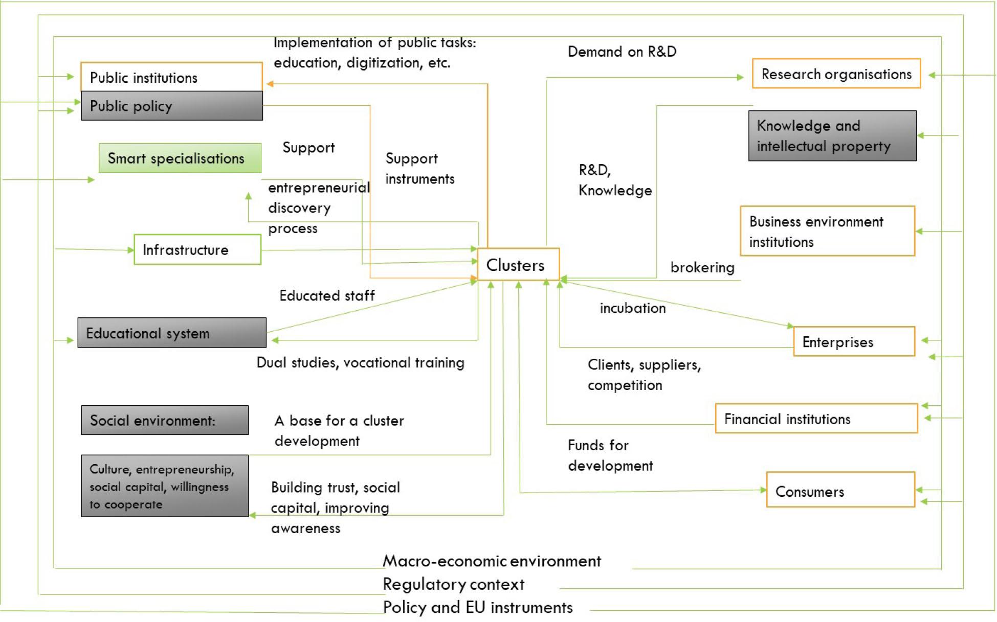 Clusters combine companies, research and development institutions and universities specialising in a given industry or area of knowledge and infrastructure that can be utilised to invent new products or services. The existence of such structures provides governments with an excellent opportunity to promote economic growth by supporting innovation and R&D (Christensen, Lämmer-Gamp, & Gerd Meier zu Köcker, 2012). The ability to collaborate in knowledge creation within regional innovation systems is one of the factors making clusters a key point of this system. The linkages with other institutions in the regional ecosystem are presented in Figure 1.