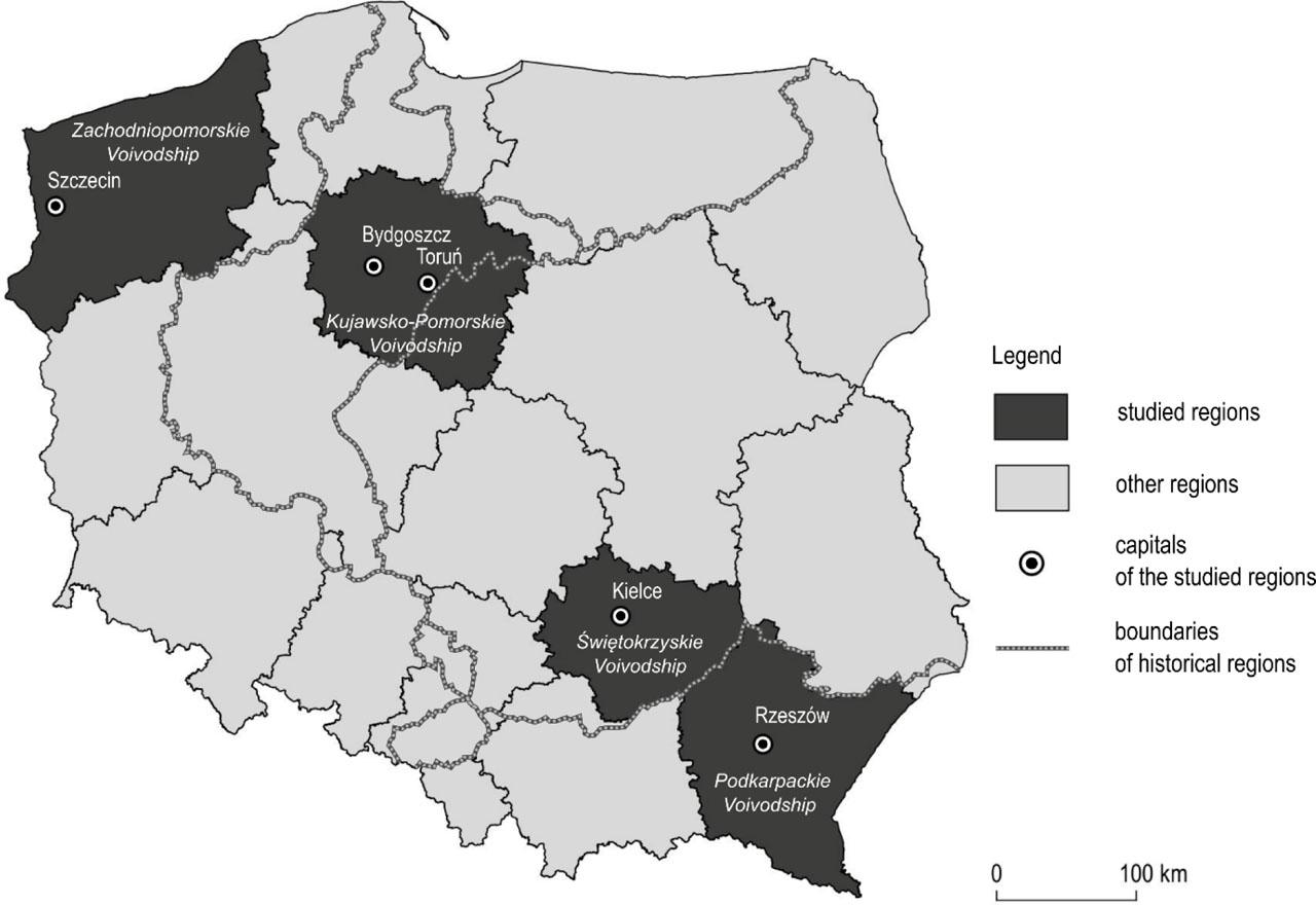The paper adopts a regional approach, which is the one most commonly used in analyses of cluster-based policies, and focuses on four regions deliberately selected for having their capital cities that lack the potential of a metropolis (Metropolitan affiliation was conducted based on Smętkowski et al. (2009)). It was assumed that having a strong metropolitan centre could potentially strongly centralise the analysed phenomena and weaken the regional dimension of the results. To exploit the explanatory power of the two key variables and bearing in mind the long duration of social processes (Braudel & Wallerstein, 2009; Gorzelak, 2009), the selected administrative regions, referred to as voivodships, have different cultural and economic backgrounds (Swianiewicz et al., 2000). The Zachodniopomorskie Voivodship contains territories whose historical development and planning happened under Prussian rule, before the region became Polish. The Kujawsko-Pomorskie Voivodship, formerly mostly under Prussian influence (during the time of the partitions of Poland which lasted from the late 18th to early 20th century and also included, among others, today's Świętokrzyskie and Podkarpackie Voivodships), underwent industrialisation in the 19th century. The Świętokrzyskie Voivodship contains areas with the background of Russian influence, with low levels of industrialisation. Finally, the Podkarpackie Voivodship has the background of a former Austrian influence, under which it enjoyed relatively strong civic freedoms, but relatively low levels of industrialisation.