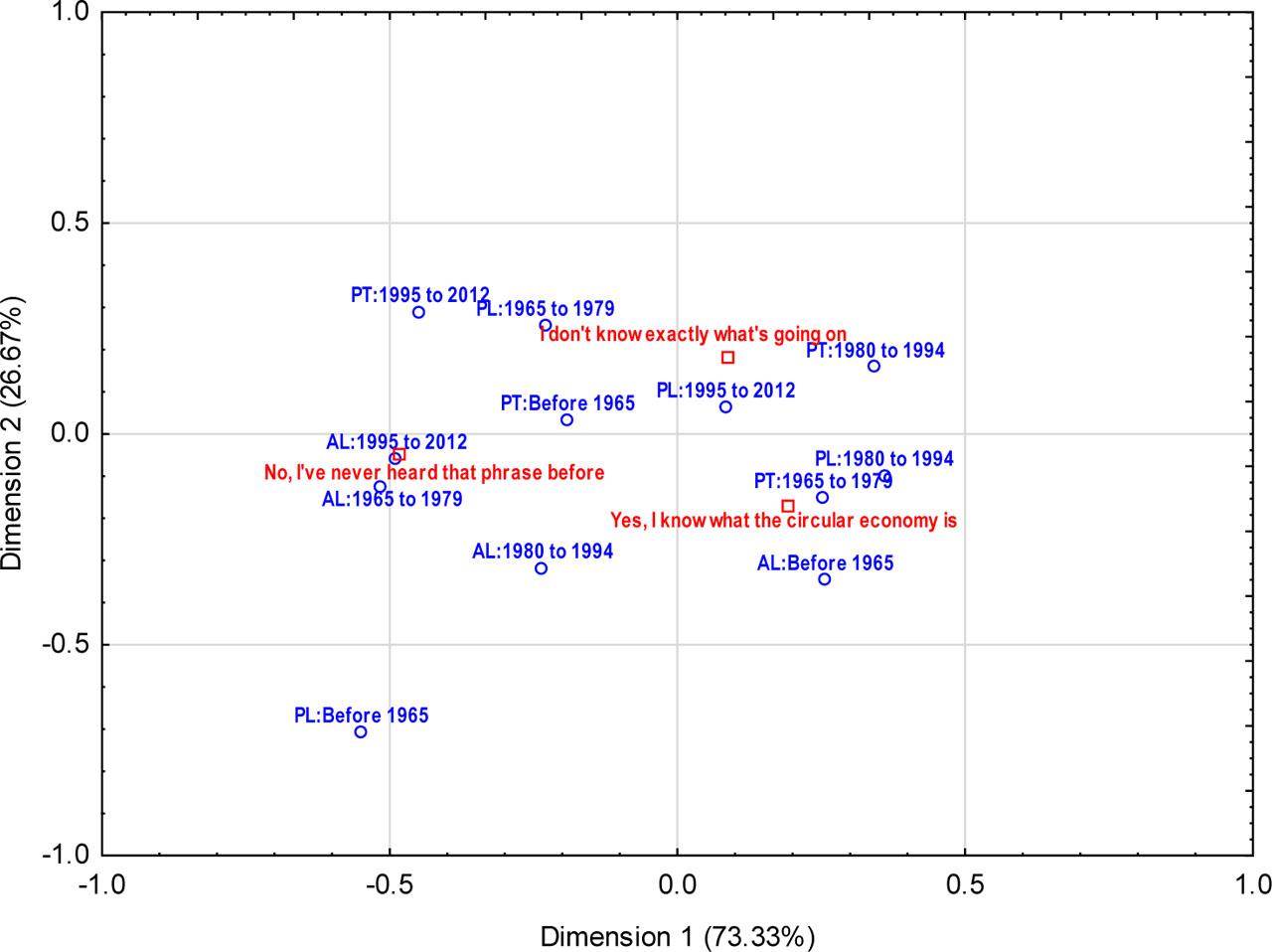 An important issue in the context of the CE is the respondents’ definition of “Which of the following terms do you associate most with the term ‘circular economy’?”. In order to verify the assumption that the demographic characteristics of respondents delineate levels of CE knowledge and awareness (H2), a correspondence analysis was carried out between respondents’ profiles, their country and their age group. The statistical value of the significance level and critical value (χ2 =52.375, df = 33, p = .0174) allowed us to reject the null hypothesis.