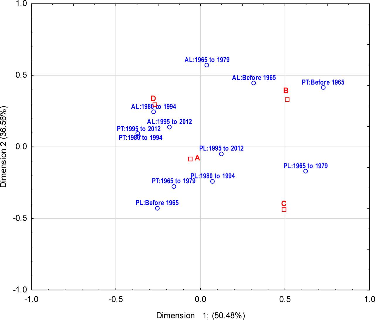 The coordinate values of the rows (Table 4) indicate the highest level of projection quality in two-dimensional space for data for Portugal Before 1965 (0.998). Referring to the data contained in Table 3, the lowest value of the quality measure is recorded in the column containing the point Poland 1965 to 1979 (0.8169). This means that in this case, the original configurations of points in factorial space have undergone the greatest distortion. The points representing row and column profiles are presented graphically in the form of a two-dimensional factorial space below (Figure 6).