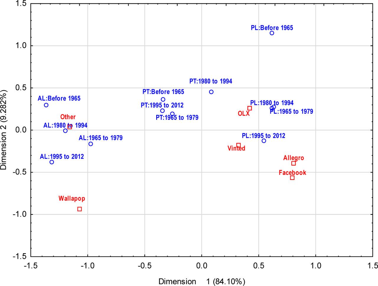The value of the percentage of inertia indicated the possibility of accepting the presentation of dependencies in two dimensions. The cumulative percentage for the two dimensions is 93.38% (dimension 1: 84.10%, dimension 2: 9.28%). Polish respondents and those from Portugal (of all generations) were closest to the centre of the coordinate system. Respondents from Albania were the furthest from the centre. This points to the fact that popular places to purchase second-hand goods are differentiated by nationality to a greater extent than by generation. In general, most of the Albanians reported using apps other than OLX, Vinted or Wallapop.