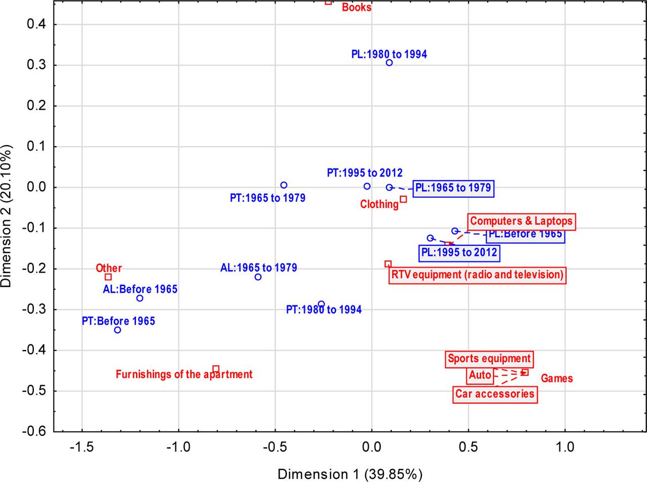Inferences about the relationships between the categories of nominal variables studied take place on the basis of the arrangement of points representing these categories, as presented on the perception map. The following hypotheses about the assumed relationship between respondents’ indications and demographic characteristics (country and generation) were considered: