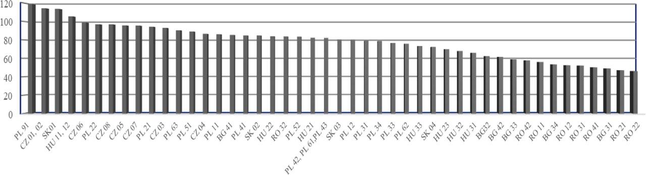 In the discussed group, apart from the abovementioned ones, almost all Romanian and Bulgarian regions were characterized by the lowest level of RCI, which allowed them to be classified in the lowest positions of the ranking (Figure 1).