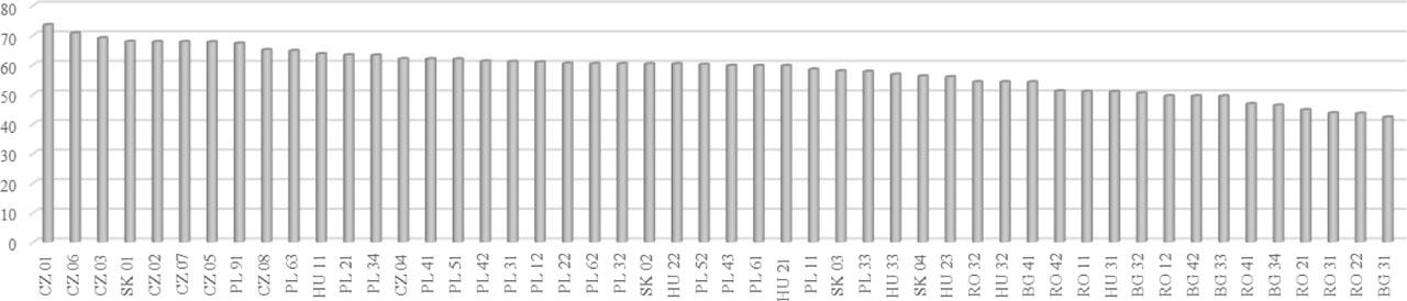 A comparative analysis of the countries of Central and Eastern Europe in terms of regions shows that in 2020, the highest level of social progress was characterized by the regions of the Czech Republic (SPI level ranged from 73.48 to 65.07), Slovakia (SPI level 64.86), Poland (SPI level ranged from 67.25 to 63.30), and Hungary (SPI level was 63.63) (Figure 2). The lowest level of SPI was recorded in the regions of Romania, Bulgaria, and Hungary (SPI ranged from 50.45 to 43.27) (Table 1).