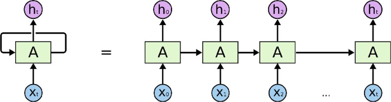 The study is divided into three stages. The first stage involves forecasting open-end investment fund returns using a recurrent neural network (RNN). RNNs are designed to model and predict sequential data by introducing state variables to store past information and the current inputs to determine the current outputs. A simple RNN has a feedback loop, as shown in Figure 1. The block labelled “A” represents a simple feed-forward neural network. The feedback loop on the left-hand side of the equality sign can be unrolled into time steps to produce the second network below. The input X0 is fed into the network to produce h0. In the next step, the input is X1 with an additional input from the previous step through block A, and so on. This allows the neural network to consider both the current input and the context of previous inputs.