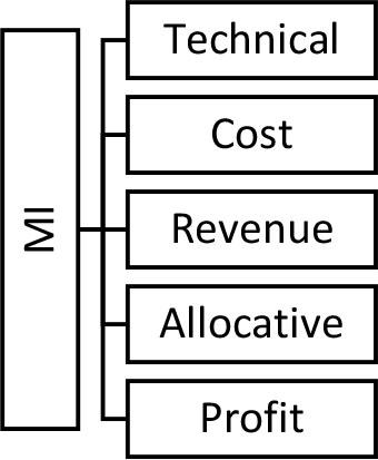 Several papers can be found in the literature outlining the use of the MI to measure different types of efficiency (Figure 2). Originally, the MI was used to measure productivity changes in technical efficiency, but in the work of Färe & Grosskopf (1992), as well as the comment by Balk (1993), indicated that it could also be used to measure productivity changes concerning other types of efficiency. Proposals for measuring productivity in terms of cost efficiency were made by Maniadakis and Thanassoulis (2004), who developed the concepts and made a proposal for the decomposition of the cost MI. This was followed by Tohidi et al. (2012) using modifications on the use of VRS, presenting the global cost MI and biennial cost MI (Tohidi & Tohidnia, 2014). Measuring profit efficiency using the MI has been suggested by Tohidi et al. (2010) and Tohidi and Razavyan (2013). Navanbakhsh et al. (2006) proposed the revenue MI and Zhu et al. (2017) proposed the allocation MI.