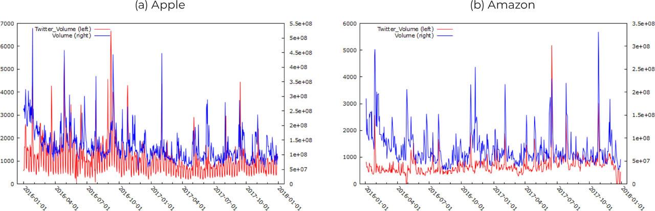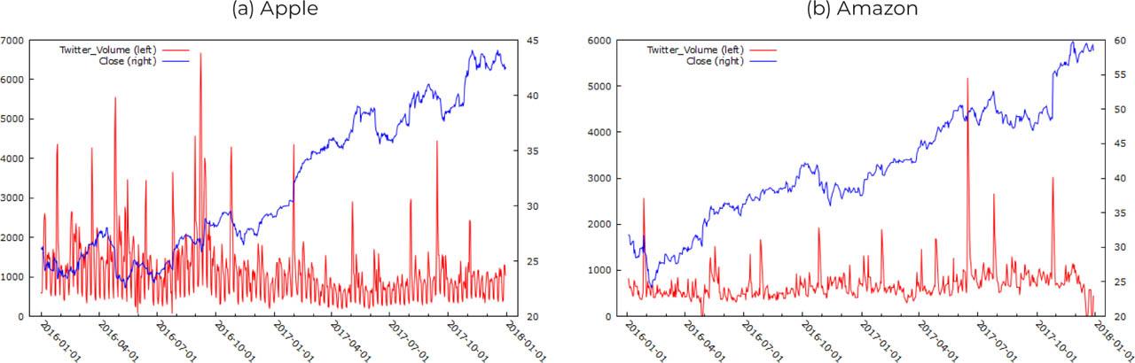 Data for Apple and Amazon was collected from 01/01/2016 to 31/12/2017 with cashtag $AAPL and $AMZN. This period was selected because Twitter data was publicly accessible via the API, ensuring completeness and consistency of the dataset. Although the study covers 2016–2017, the methodology is fully replicable and can be applied to other time periods or companies, providing a generalizable framework for examining the relationship between social media activity and stock market dynamics.