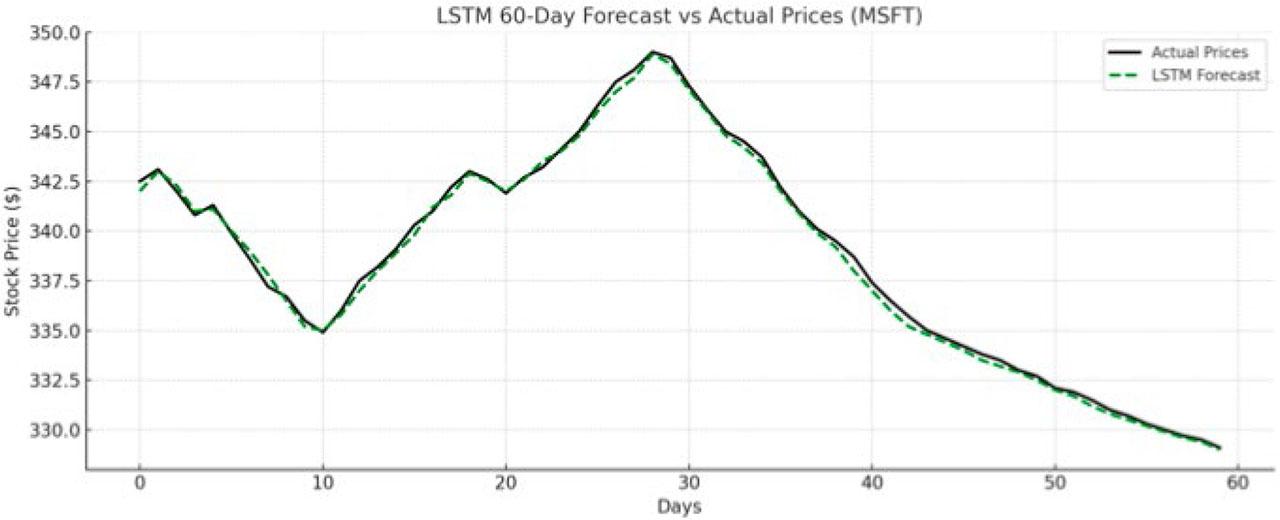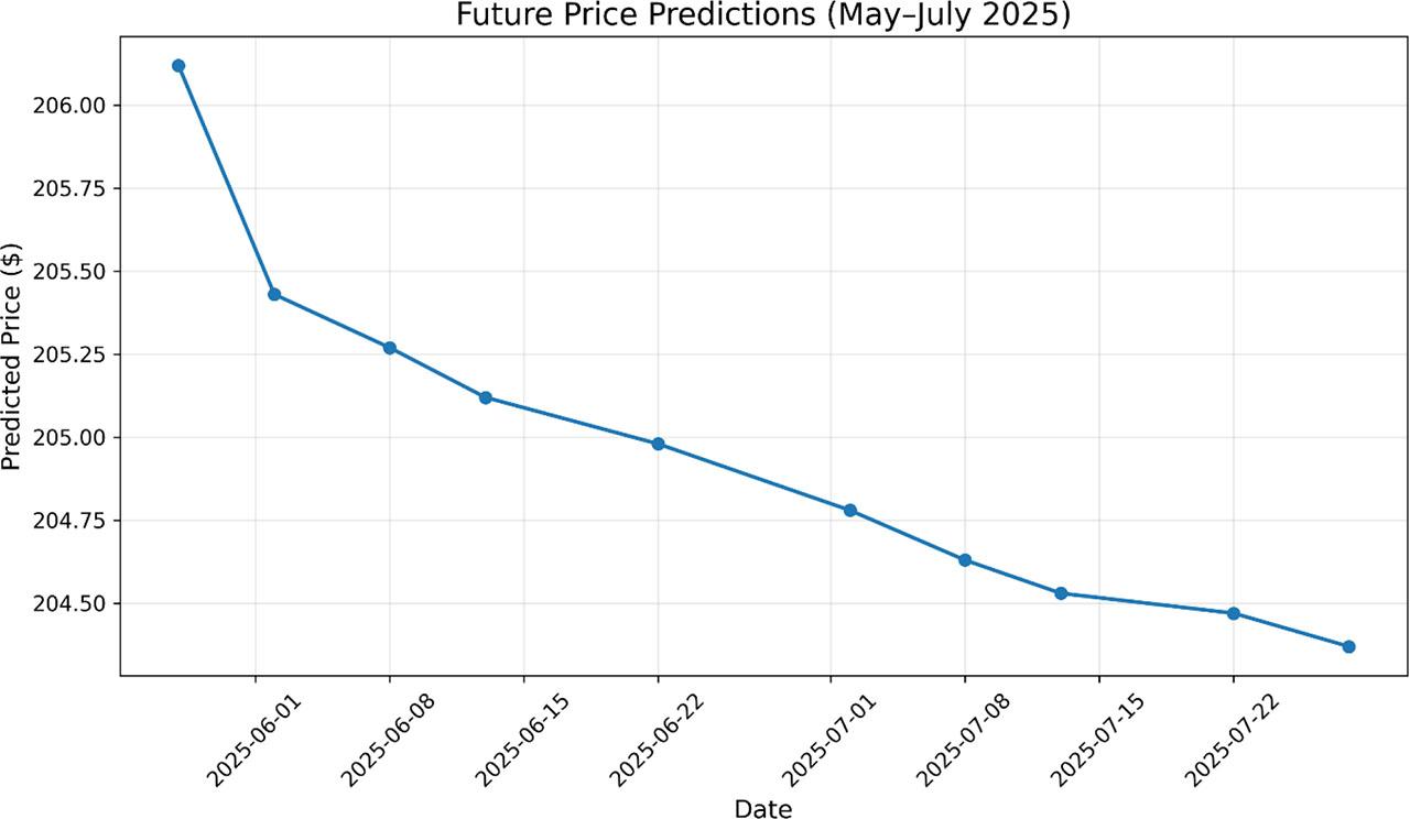 | RMSE | $3.65 | On average, predictions deviate by $3.65 from the actual closing prices. Lower RMSE indicates high precision. |