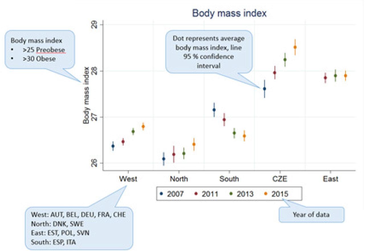 Existing evidence show general upward trend in obesity in Central and Eastern European countries. Obesity rates have been identified mainly among young adults (Vignerova et al, 2007) and also among adults (NCD-RisC, 2017). In this article, we aim to explain international differences and increasing trend in obesity in the Czech Republic by differences in sociodemographic structure and transition into retirement. The research question is motivated by a descriptive picture of how obesity has developed in the Czech Republic in comparison to overall trend in Europe, including other central and eastern European countries. We select the Czech Republic as a country with high increase in childhood obesity, high prevalence of cardiovascular diseases, and high prevalence of colorectal cancer (OECD, 2017). This is a first study that show trends in obesity among older people in international perspective and try to explain cross country differences by taking into account differences in occupational and educational structure.
