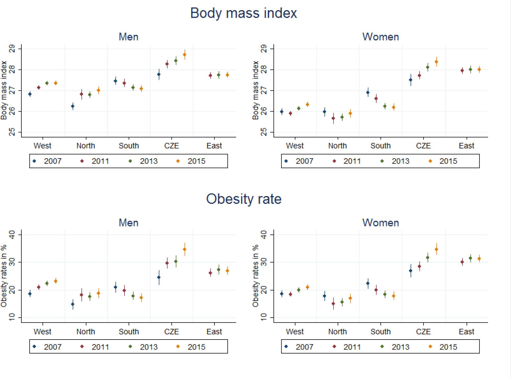 In 2015, the obesity rate for Czech men is 35%, which is almost twice as higher as that for men in Italy and Spain (South) and more than 50% higher than that for men in West. Obesity of Czech men was similar to that for men in East in 2007 (approximately 33%); since then, it increased to 35% in 2015. In the same time, almost 33% of Czech women suffer from obesity in 2015, which corresponds to the obesity rate in Estonia and Slovenia, but is 15 points higher compared to women in Western Europe.