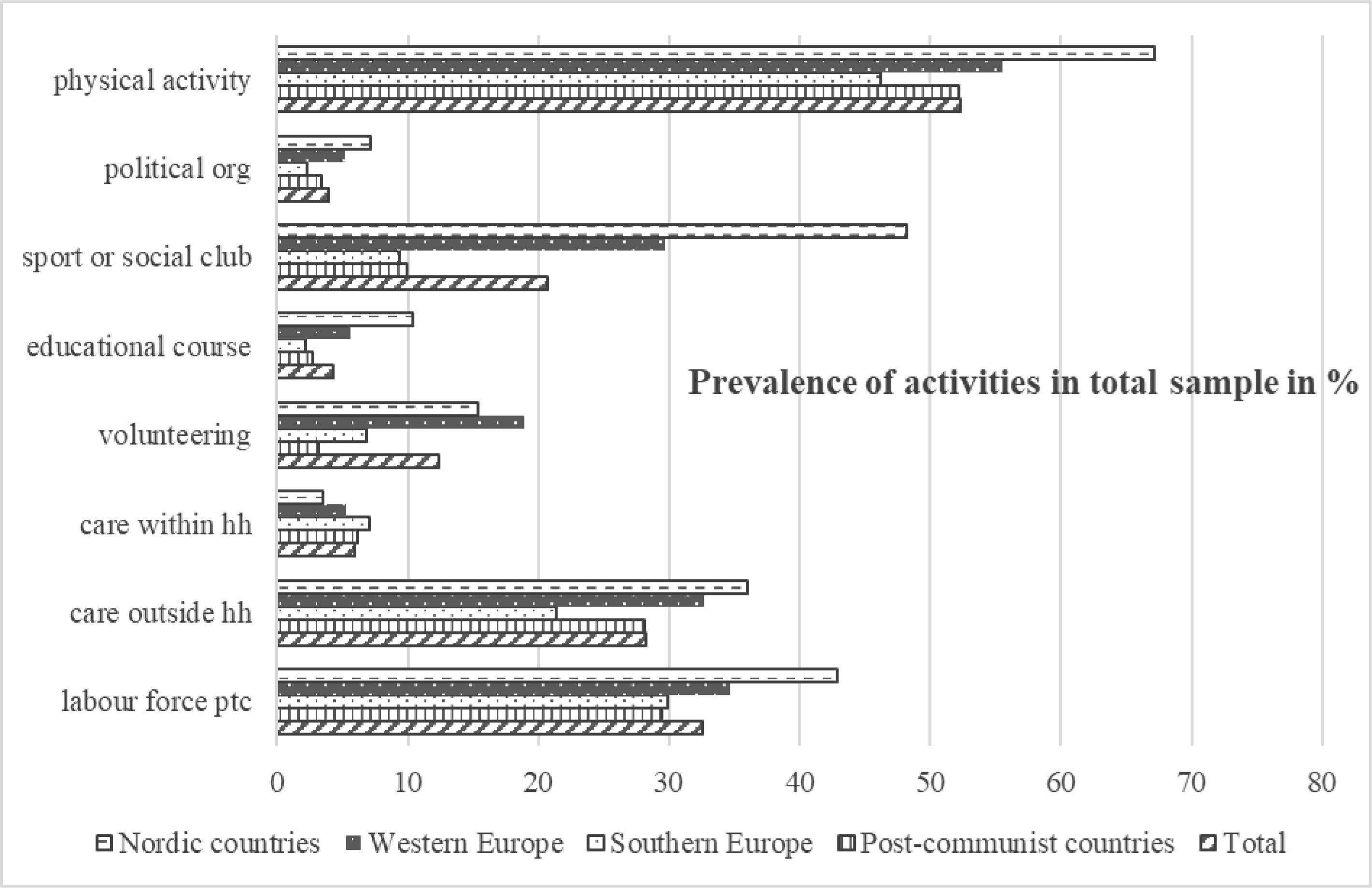 Several studies present vast differences in the prevalence of activities based on the EU country or region. The labour force participation amongst older adults is higher in Nordic countries and lower in Southern Europe with other regions in between (Zaidi et al., 2017). Furthermore, the retirement is associated with increasing obesity in Southern Europe, and to some point in Western Europe (Pertold, 2020). The occasional caregiving is more prevalent in Nordic countries and less in Southern Europe with the opposite being right for the intensive provision of care. Western Europe is close to Nordic countries and post-communist countries to Southern Europe in this regard (Albertini & Kohli, 2013; Hank & Buber, 2009; Igel & Szydlik, 2011; Neuberger & Haberkern, 2014). Finally, volunteering and social leisure as the indicators of social participation are performed by older adults more often in Nordic countries followed by Western Europe and Southern Europe with no findings for post-communist countries; this information is still incomplete (Galenkamp et al., 2016; Siegrist & Wahrendorf, 2009). The four European regions used in this paragraph are quite homogeneous and structure the data comprehensibly.