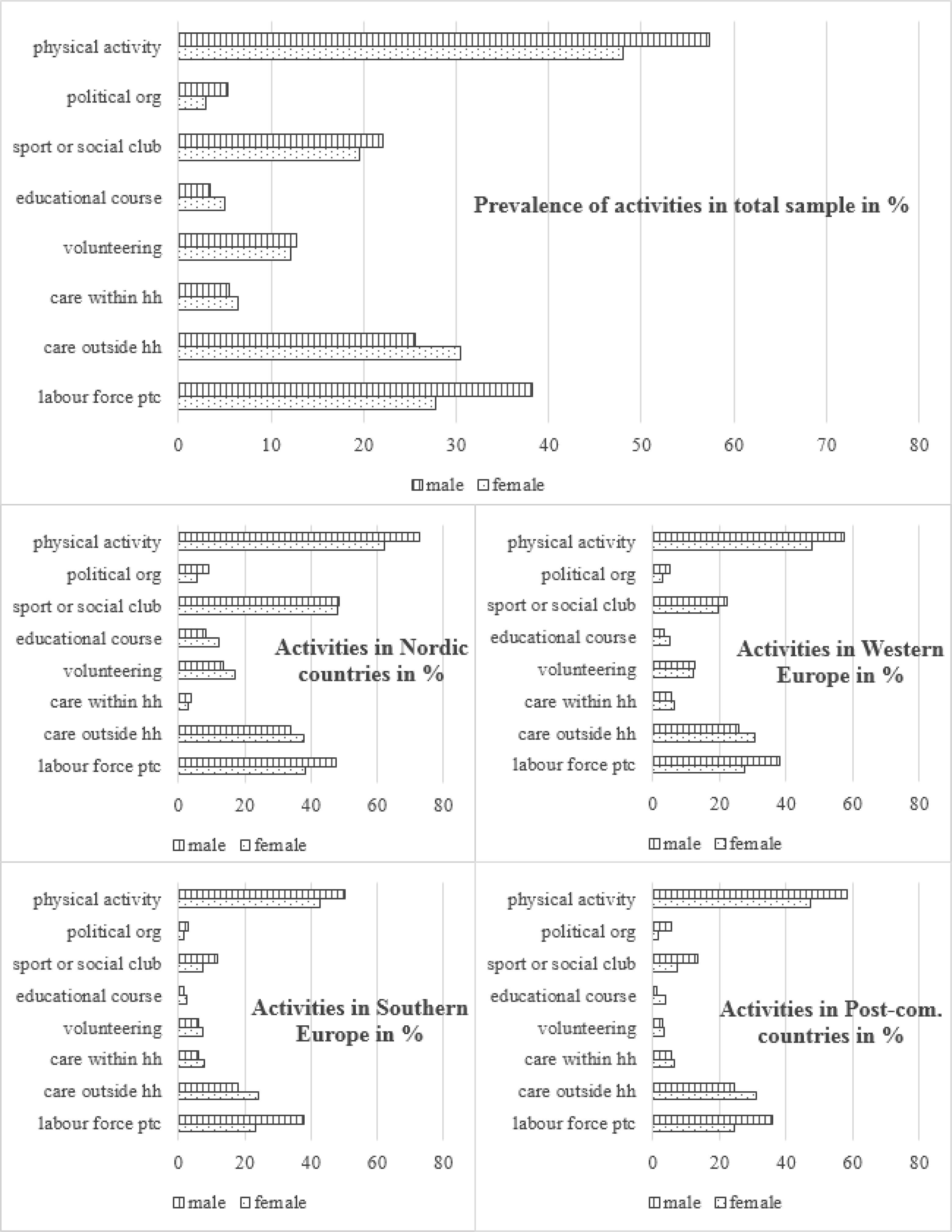 The findings in Figure 2 are based on the same data, but show the prevalence of activities across gender as the first examined individual characteristic. The upper part of Figure 2 presents the results for the pooled sample, whilst the lower part focuses on regional differences with the effect of gender. The largest differences between gender are in labour force participation (11 percentage points more for men), physical activity (9 percentage points more for men), and caregiving outside the household (5 percentage points more for women), which reflect the traditional gendered division of labour. The gender differences are similar across regions, but the Nordic countries evince a large prevalence of sport and social clubs for both men and women, together with a higher percentage of women in educational courses and volunteering activities, whilst men participate in sport or social clubs about two times more often than women in post-communist countries.